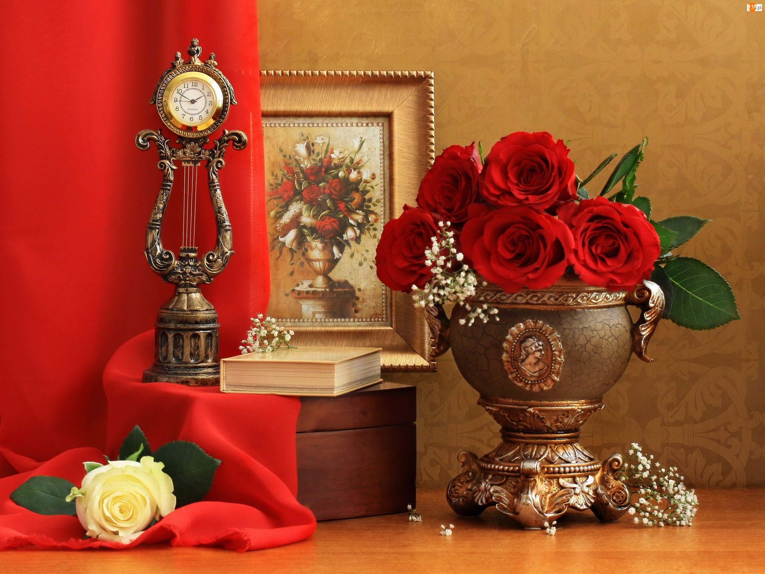 Kompozycja, Czerwone, Zegar, Róże, Książka