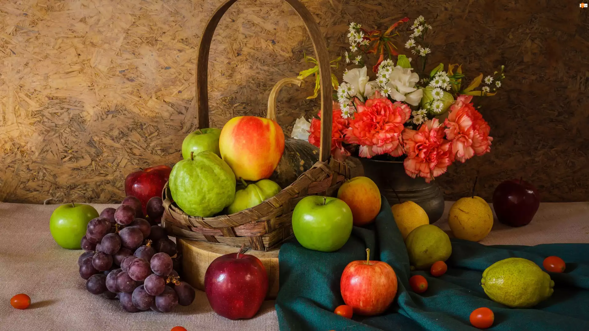 Jabłka, Gruszki, Goździki, Owoce, Bukiet kwiatów, Koszyk, Winogrona