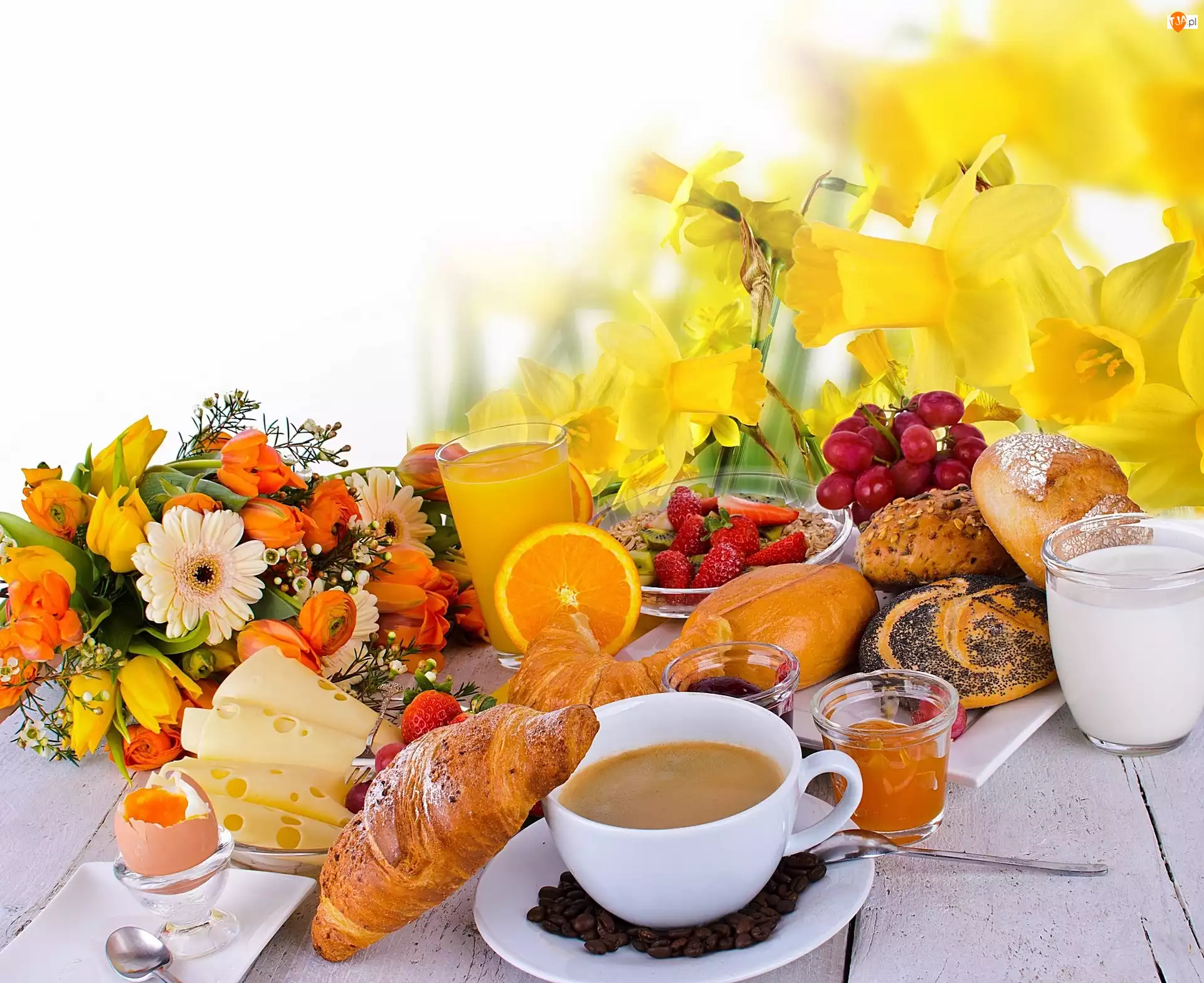 Kompozycja, Kawa, Żonkile, Bułki, Śniadanie