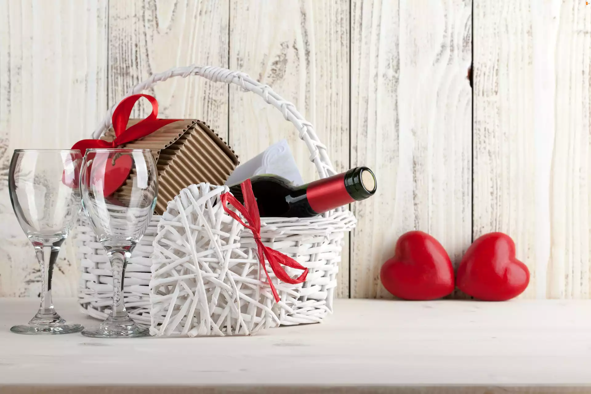 Kompozycja, Koszyk, Serduszka, Wino, Walentynki, Kieliszki, Ławka