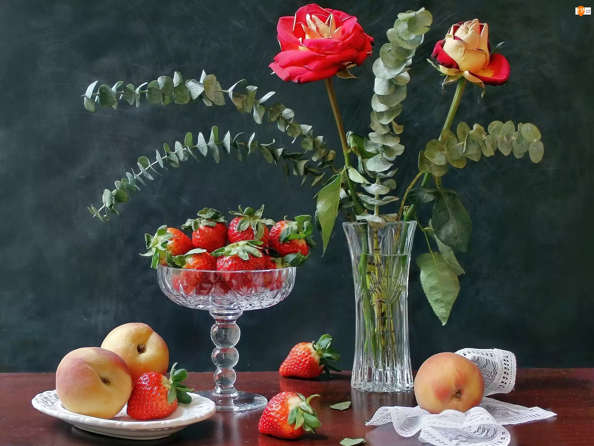 Kompozycja, Kwiaty, Patera, Róże, Truskawki
