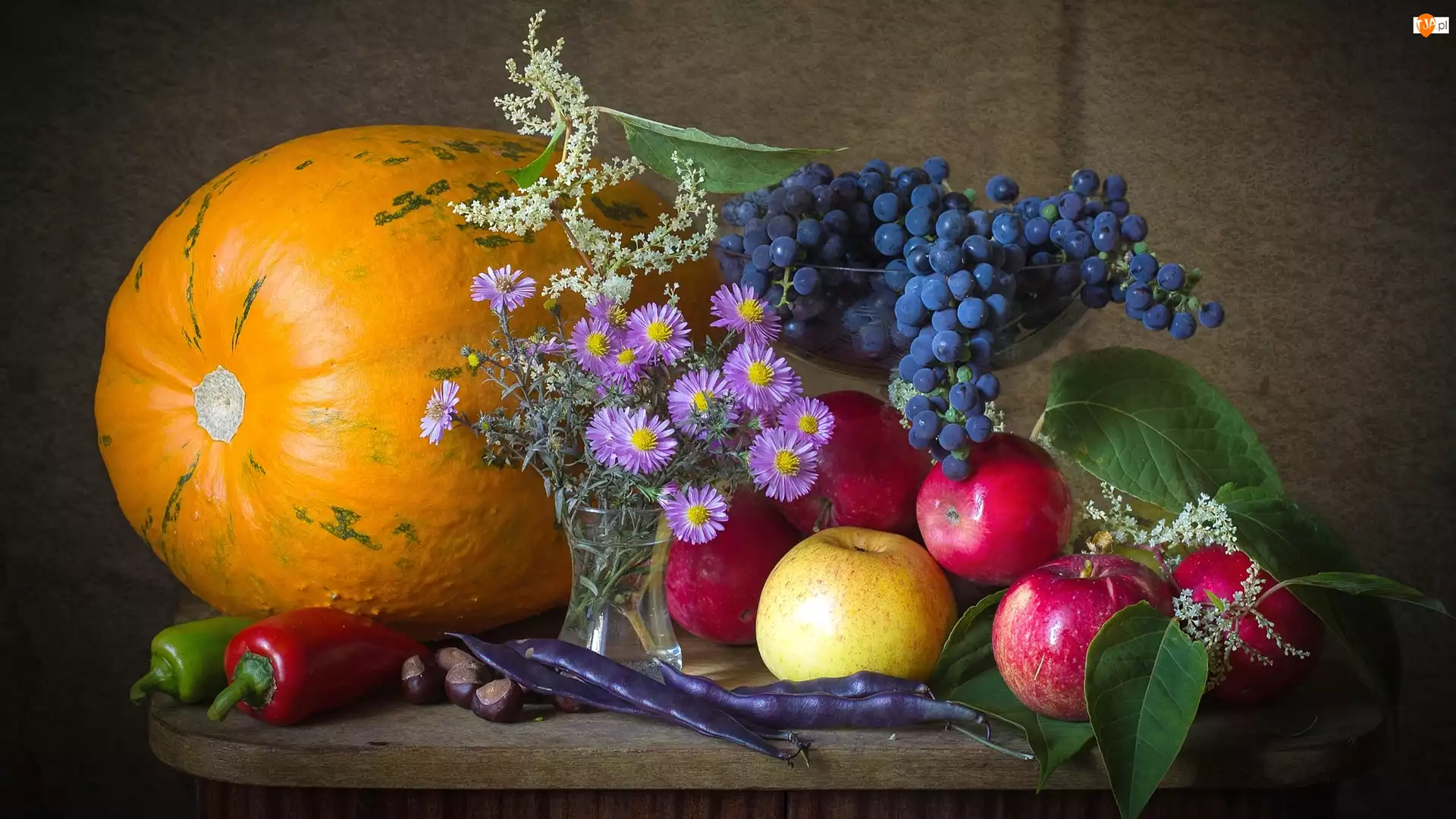 Dynia, Kompozycja, Winogrona, Astry marcinki, Jabłka, Kwiaty