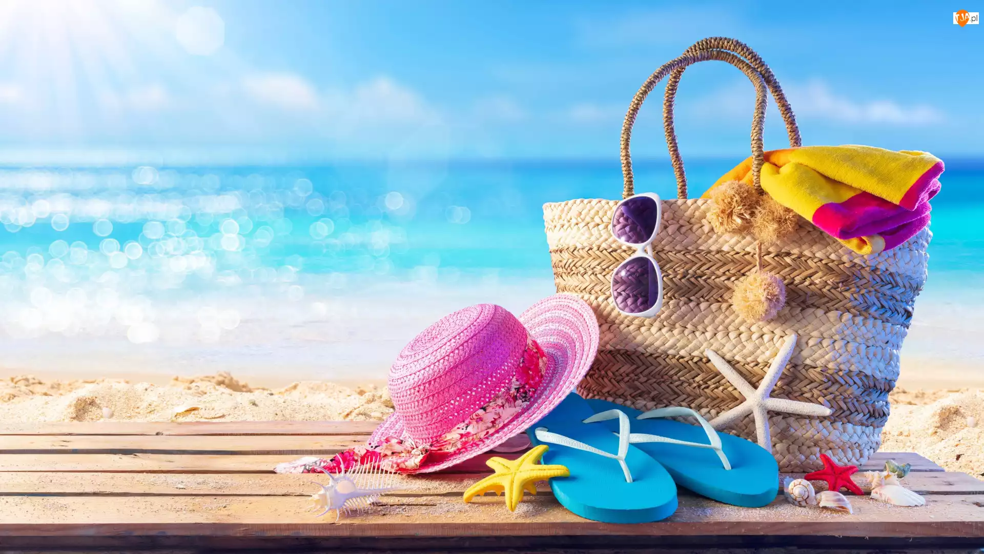 Kompozycja, Ręcznik, Okulary, Japonki, Plaża, Morze, Koszyk, Deski, Kapelusz, Rozgwiazdy