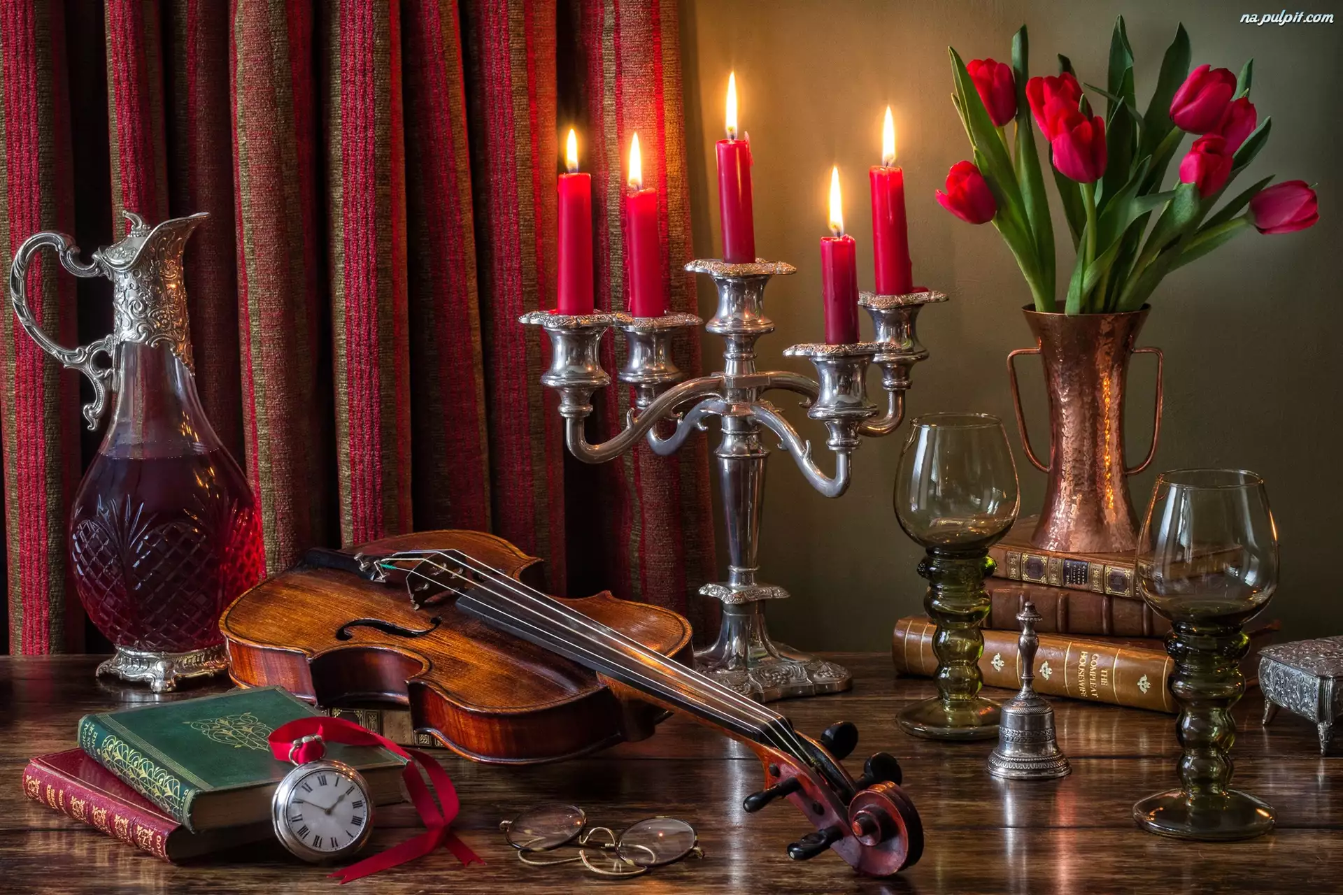 Kompozycja, Świece, Kieliszki, Kwiaty, Tulipany, Skrzypce, Karafka, Świecznik, Książki