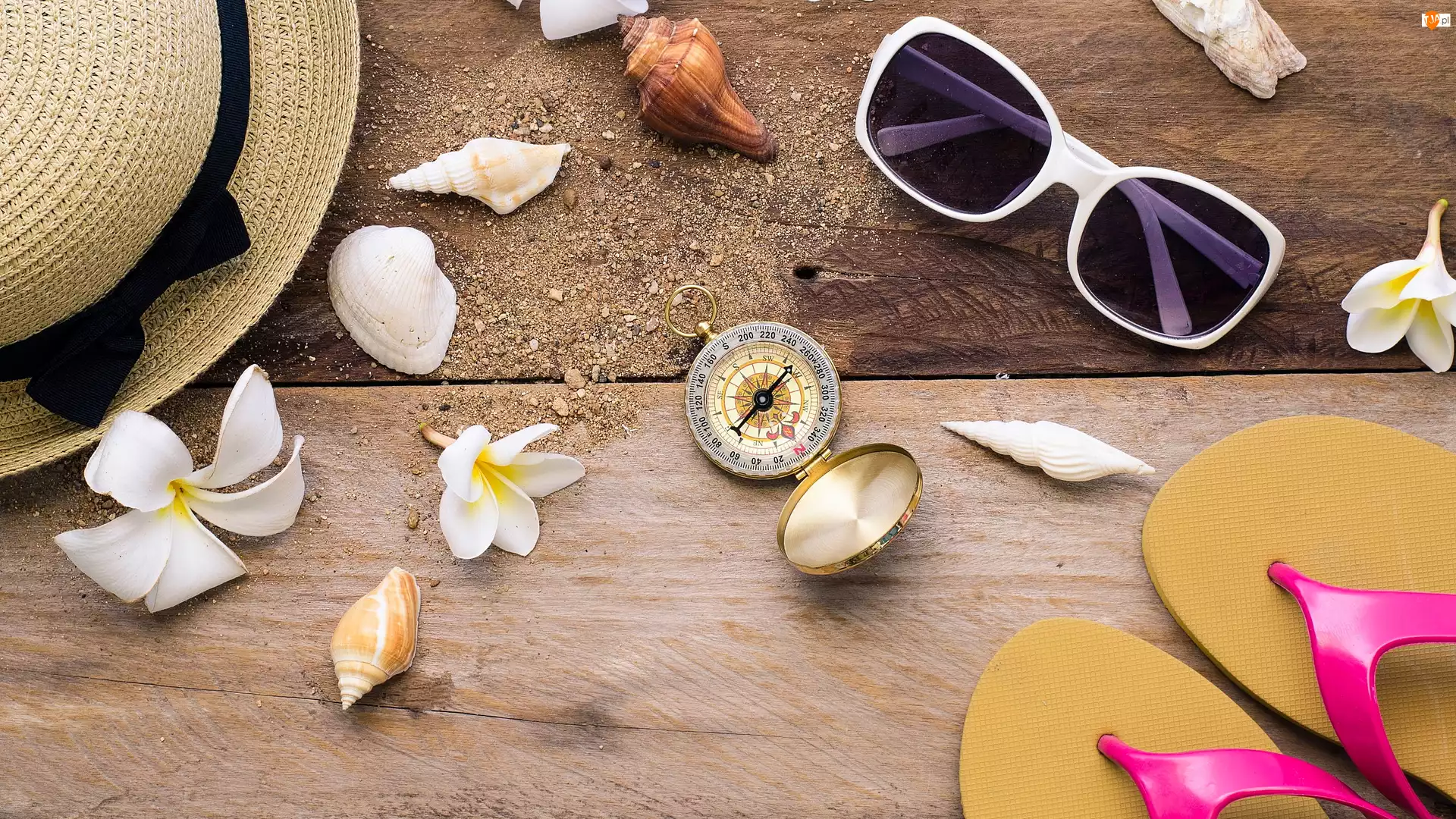 Kompozycja, Okulary, Deski, Kompas, Wakacje, Muszelki, Klapki, Kapelusz, Plumeria