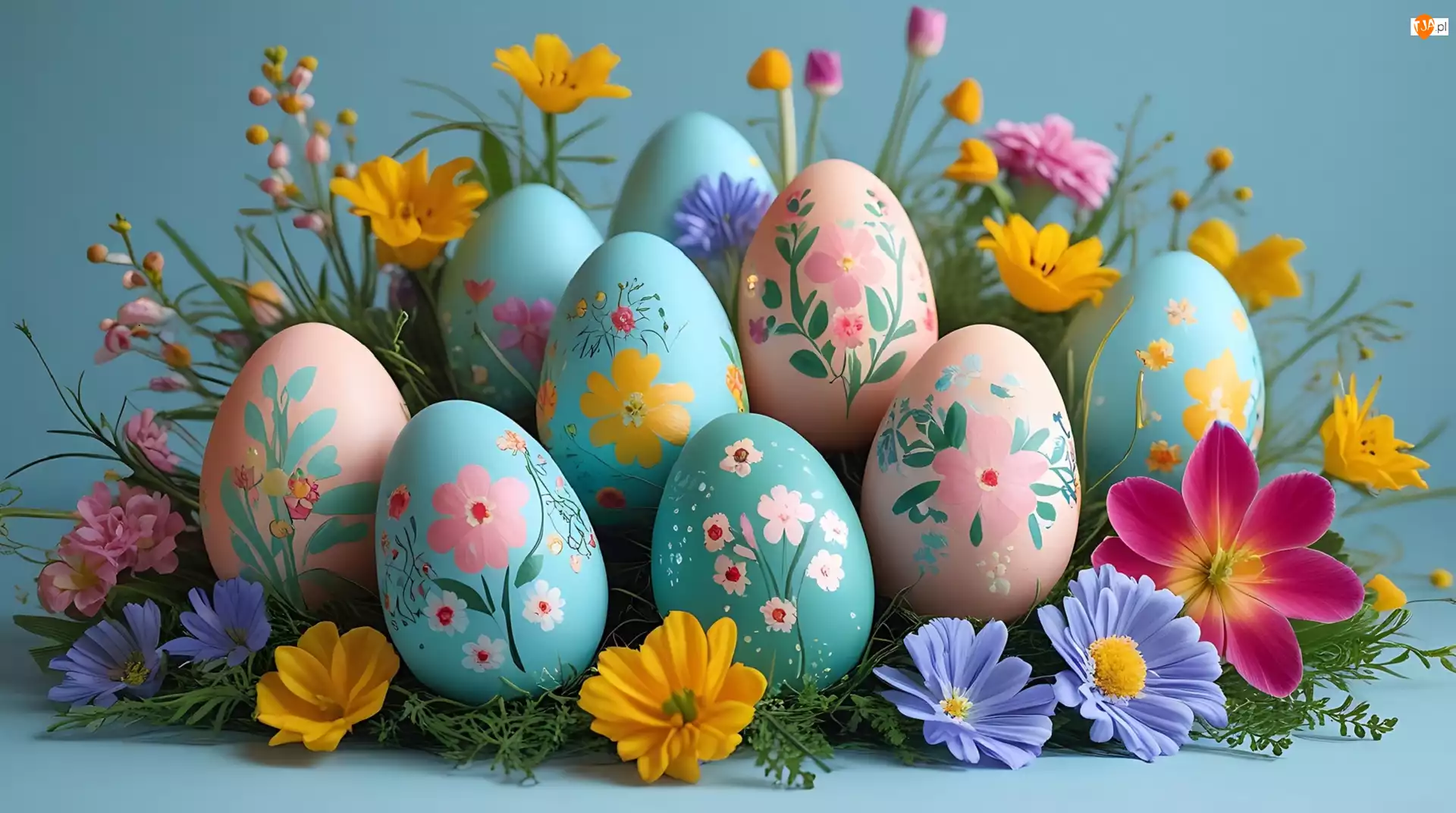 Kwiaty, Tło, Pisanki, Wielkanoc, Niebieskie
