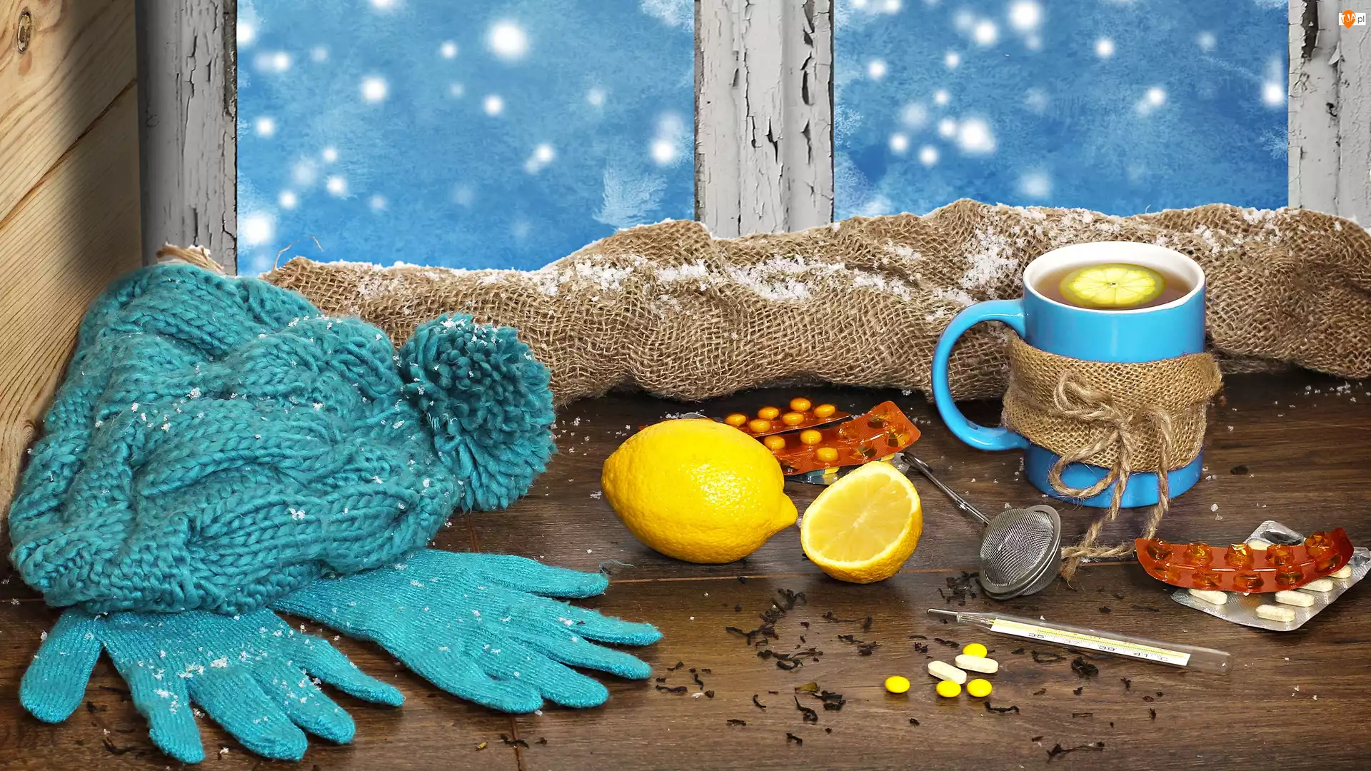 Czapka, Rękawiczki, Termometr, Okno, Tabletki, Cytryna, Herbata