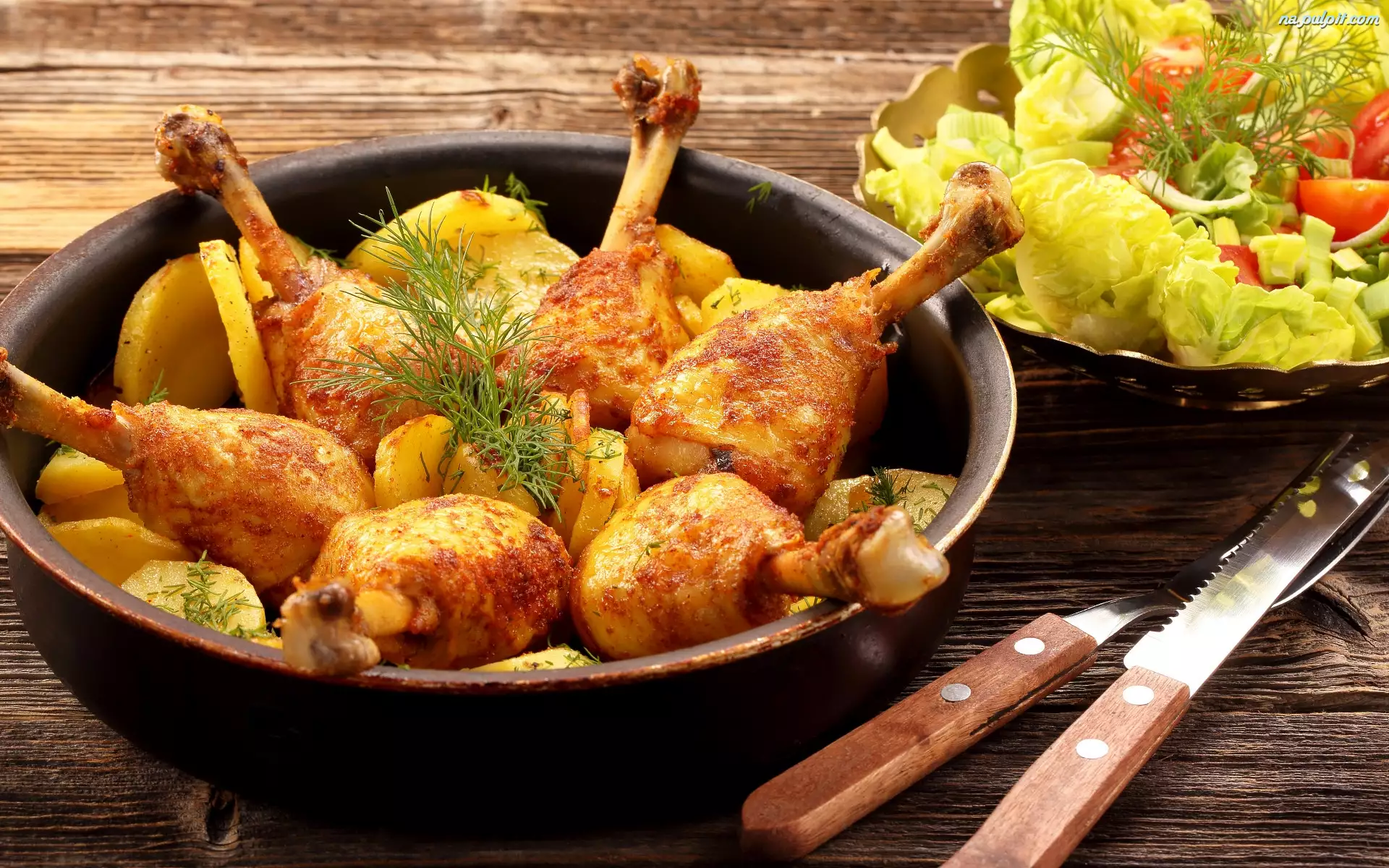 Pieczone, Kurczak, Ziemniaki, Sztućce, Pałki, Sałatka