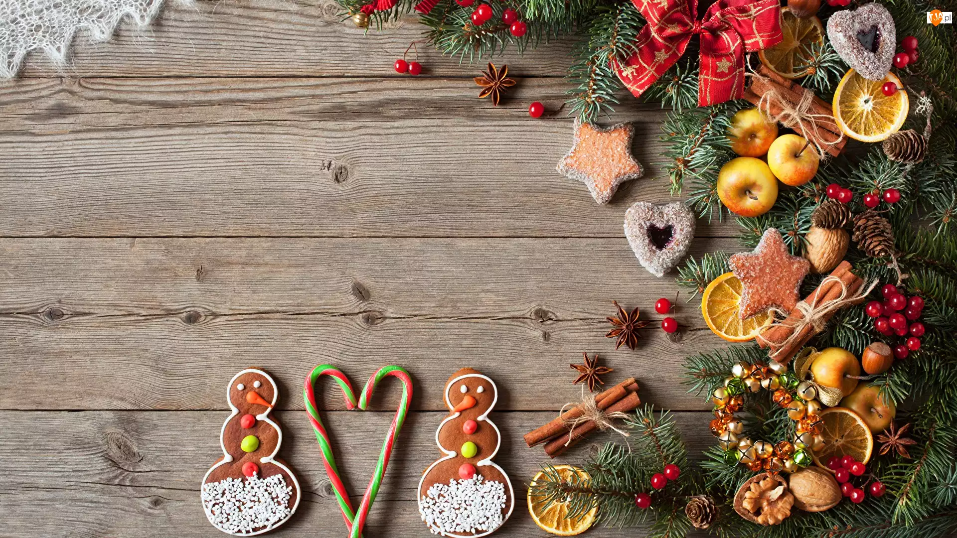 Świerka, Pierniczki, Cynamon, Bałwanki, Świąteczna, Anyżek, Ciasteczka, Kompozycja, Jabłka, Gałązki, Deski