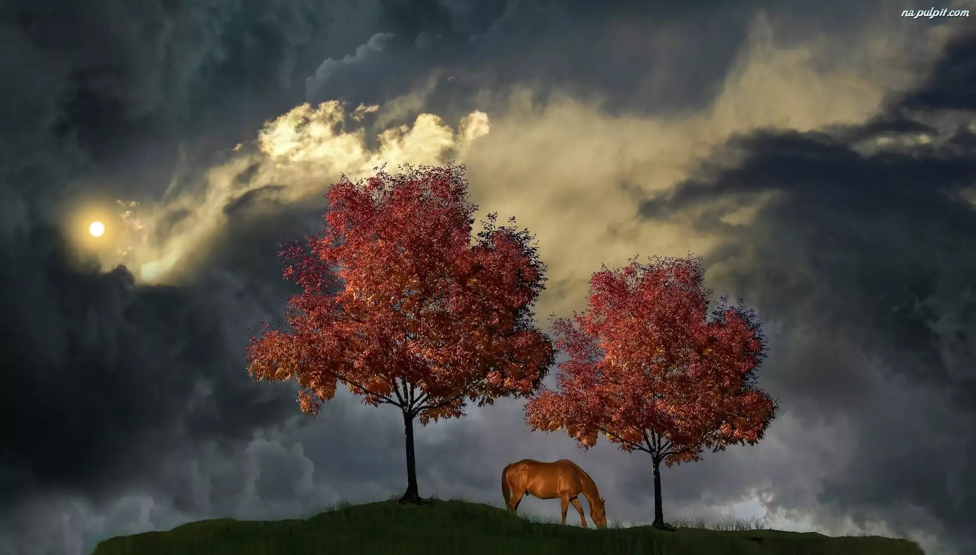Chmury, Drzewa, Koń, Niebo