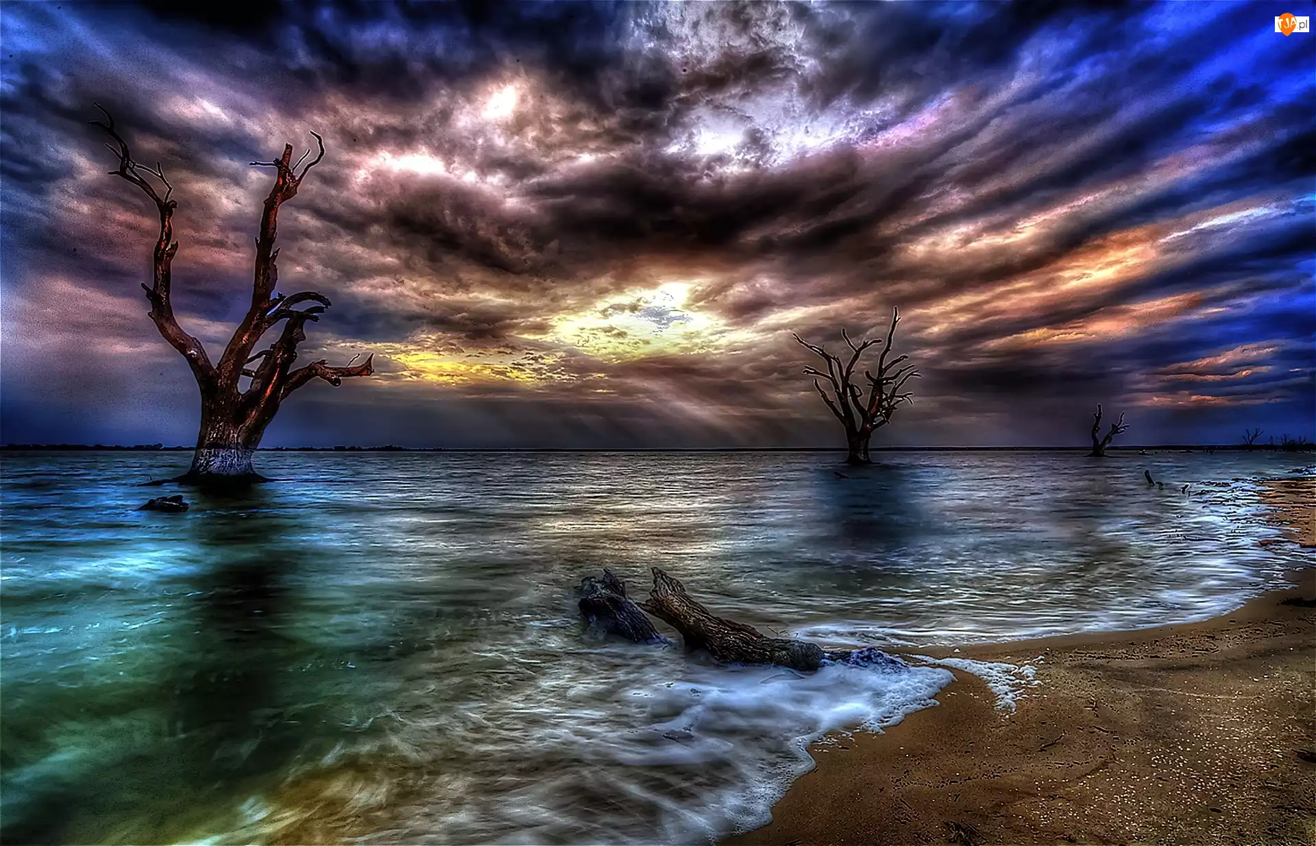Morze, Plaża, Drzew, Chmury, Konary, Słońca, Zachód