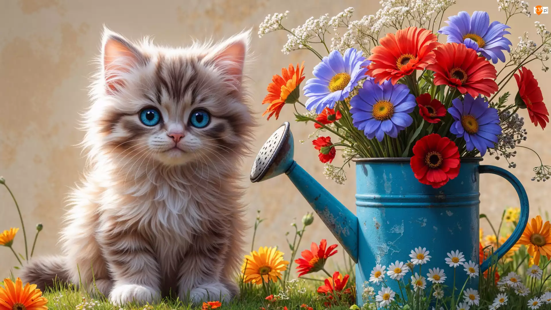 Konewka, Mały, Niebieskie, Kolorowe, Puszysty, Oczy, Kwiaty, Kot