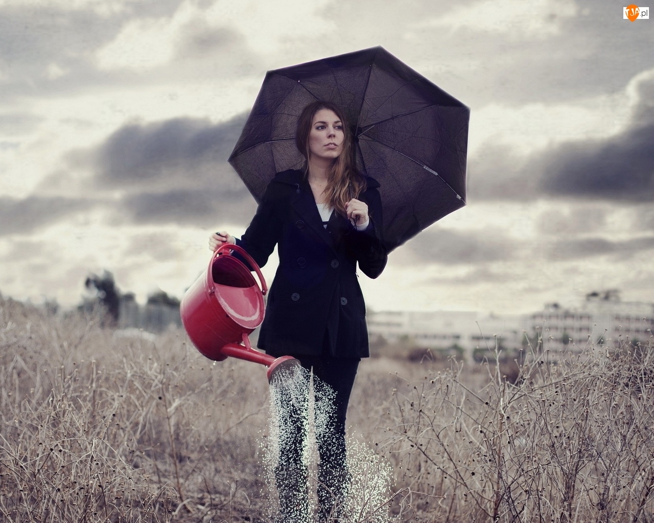 Konewka, Parasolka, Pole, Kobieta, Woda, Czarna, Czerwona