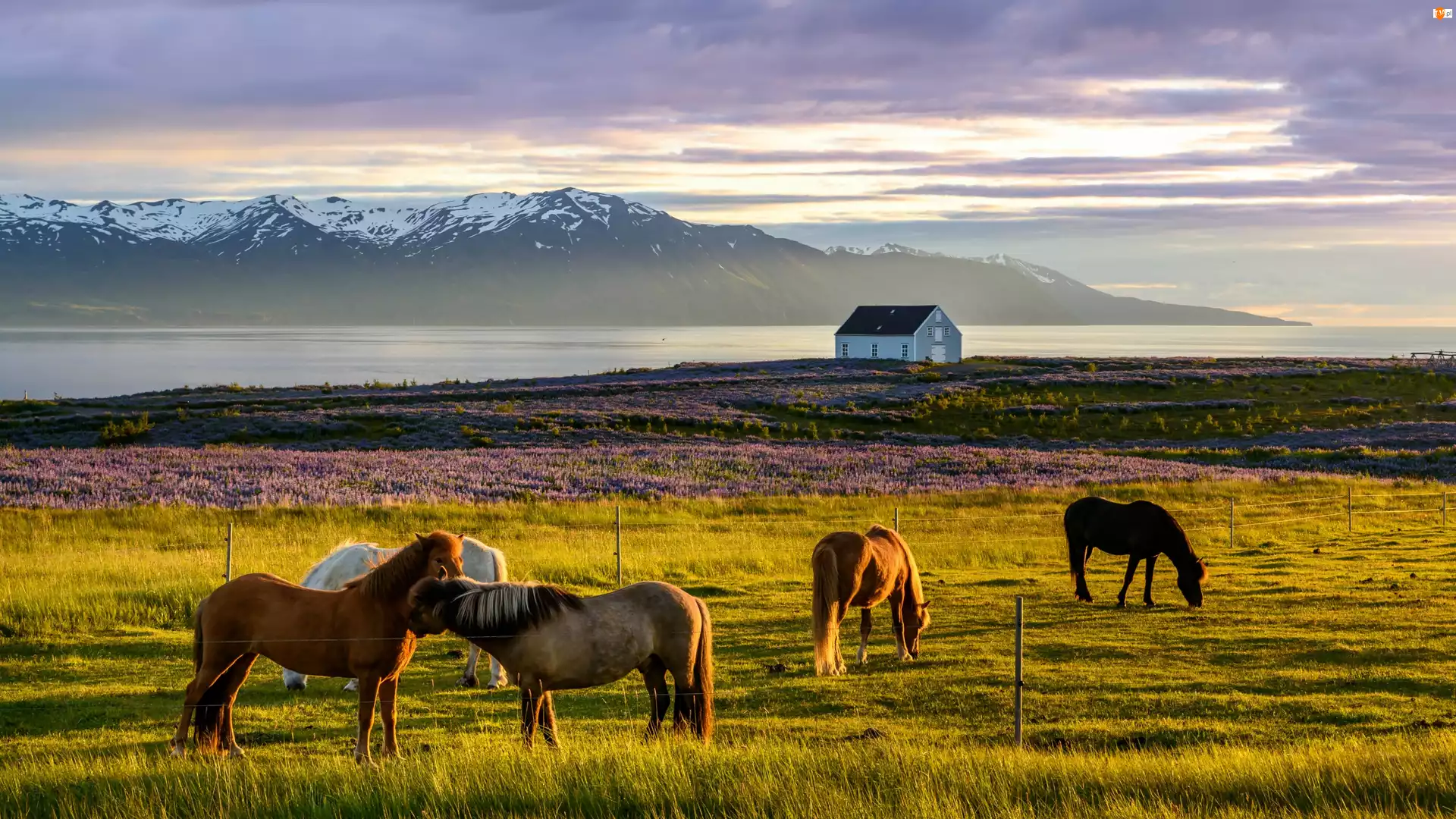 Konie, Wrzosy, Islandia, Dom, Fiord Skagafjordur, Łąka