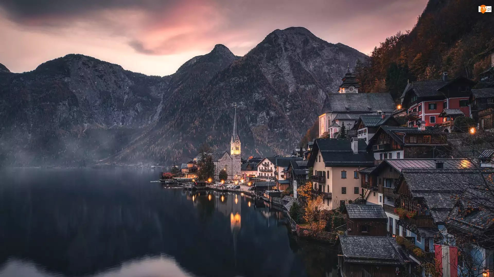 Kościół, Góry, Mgła, Austria, Alpy Salzburskie, Domy, Hallstatt, Jezioro Hallstattersee