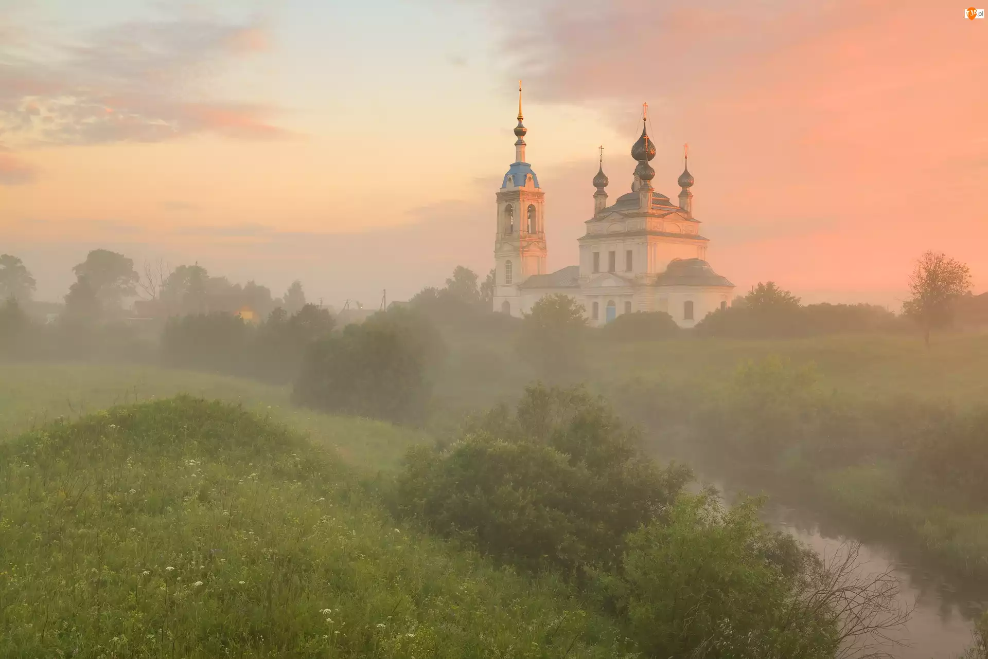 Cerkiew, Wschód słońca, Mgła, Drzewa, Jesień, Rzeka