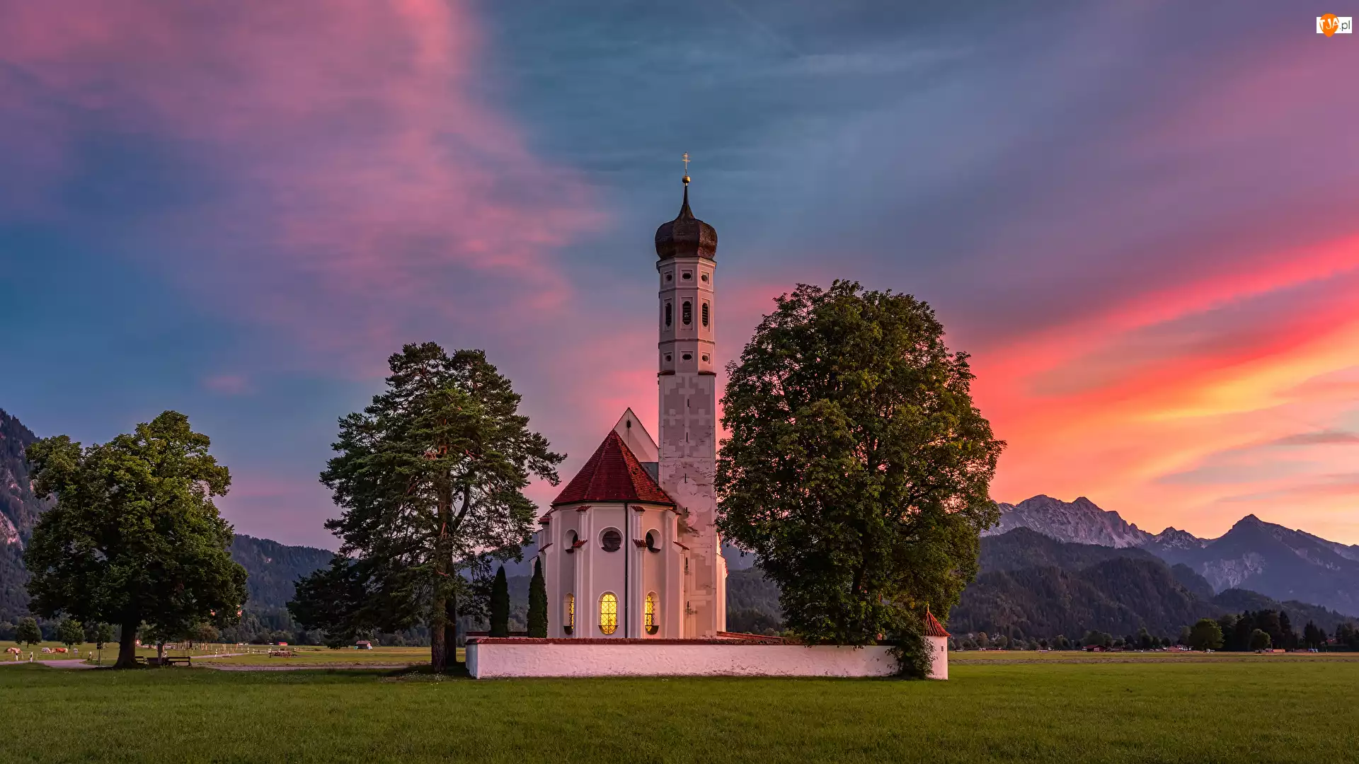 Zachód słońca, Bawaria, Niebo, Kościół Eglise Saint Coloman, Drzewa, Schwangau, Góra, Niemcy, Kościół