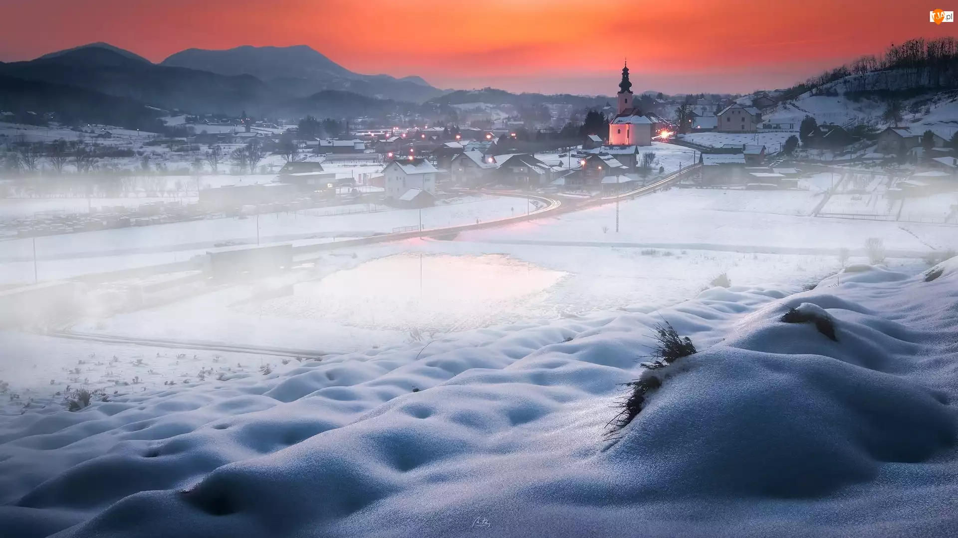 Wieś Bednja, Zima, Kościół, Mgła, Chorwacja, Zachód słońca