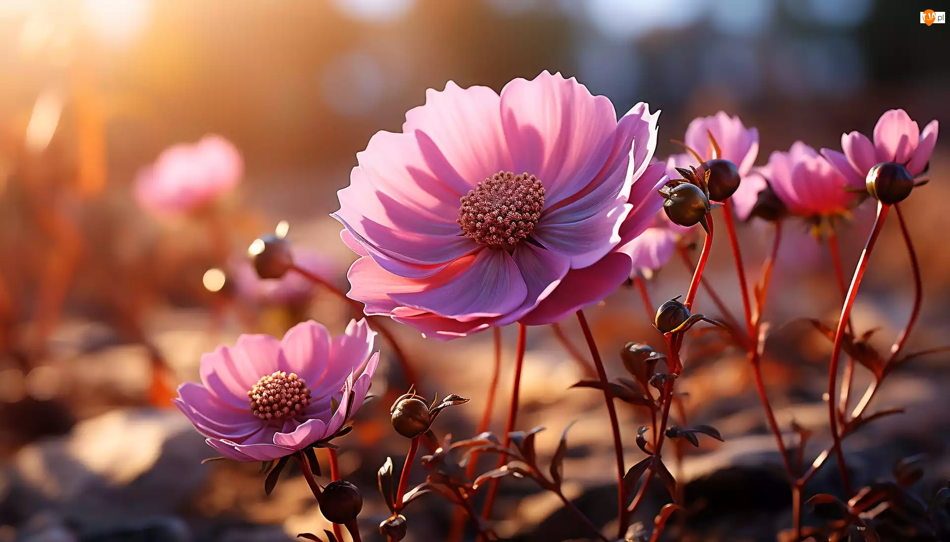 Kosmea, Grafika, Kwiaty, Różowe, Zachód słońca