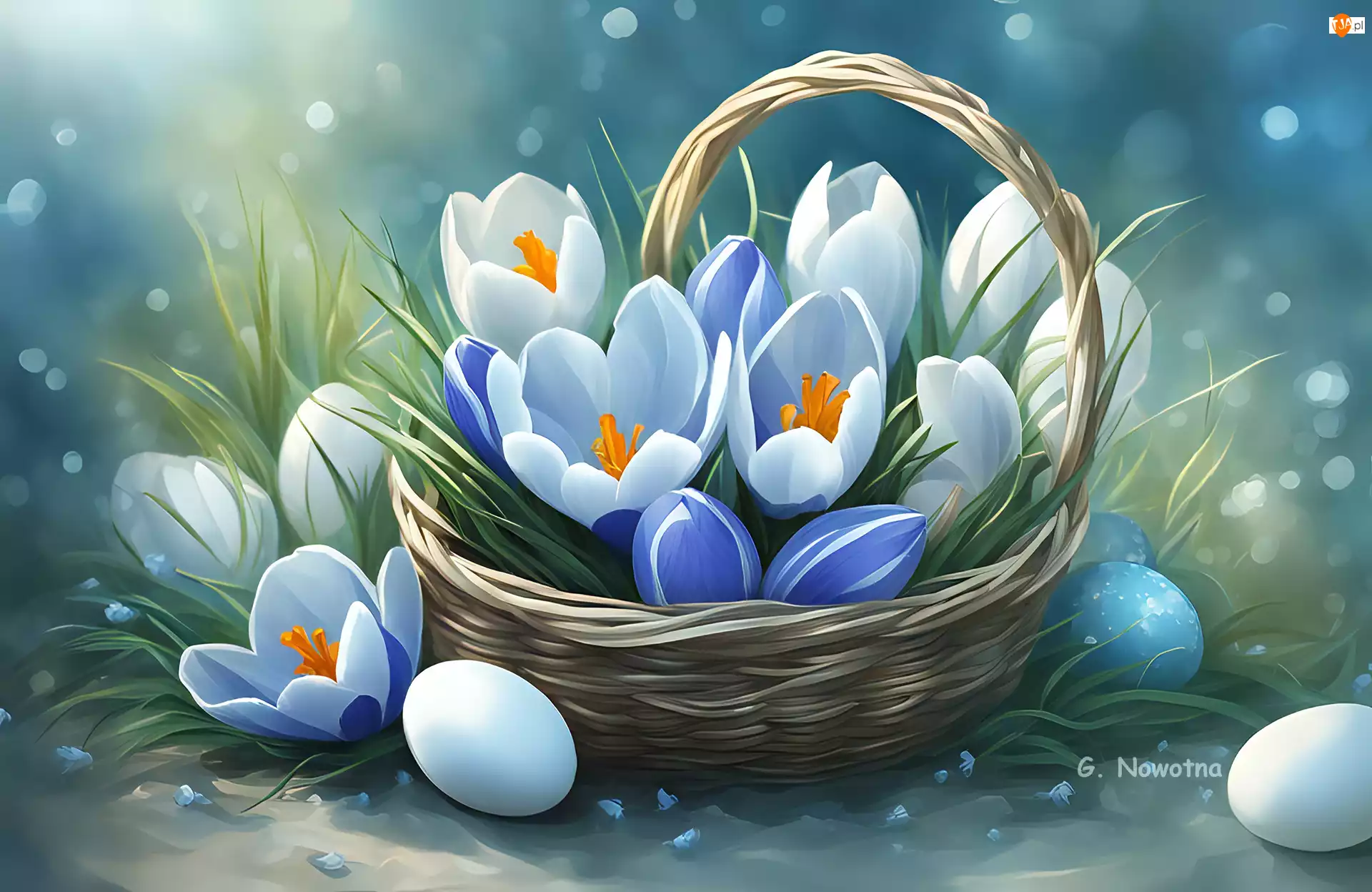 Kosz, Krokusy, Jajka, Wielkanoc, Pisanki, Trawa