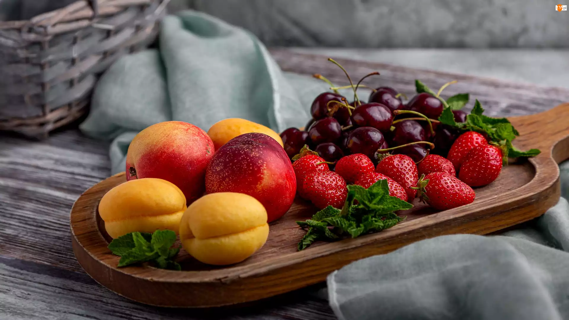 Koszyk, Deska, Materiał, Truskawki, Mięta, Morele, Nektarynki, Owoce, Czereśnie