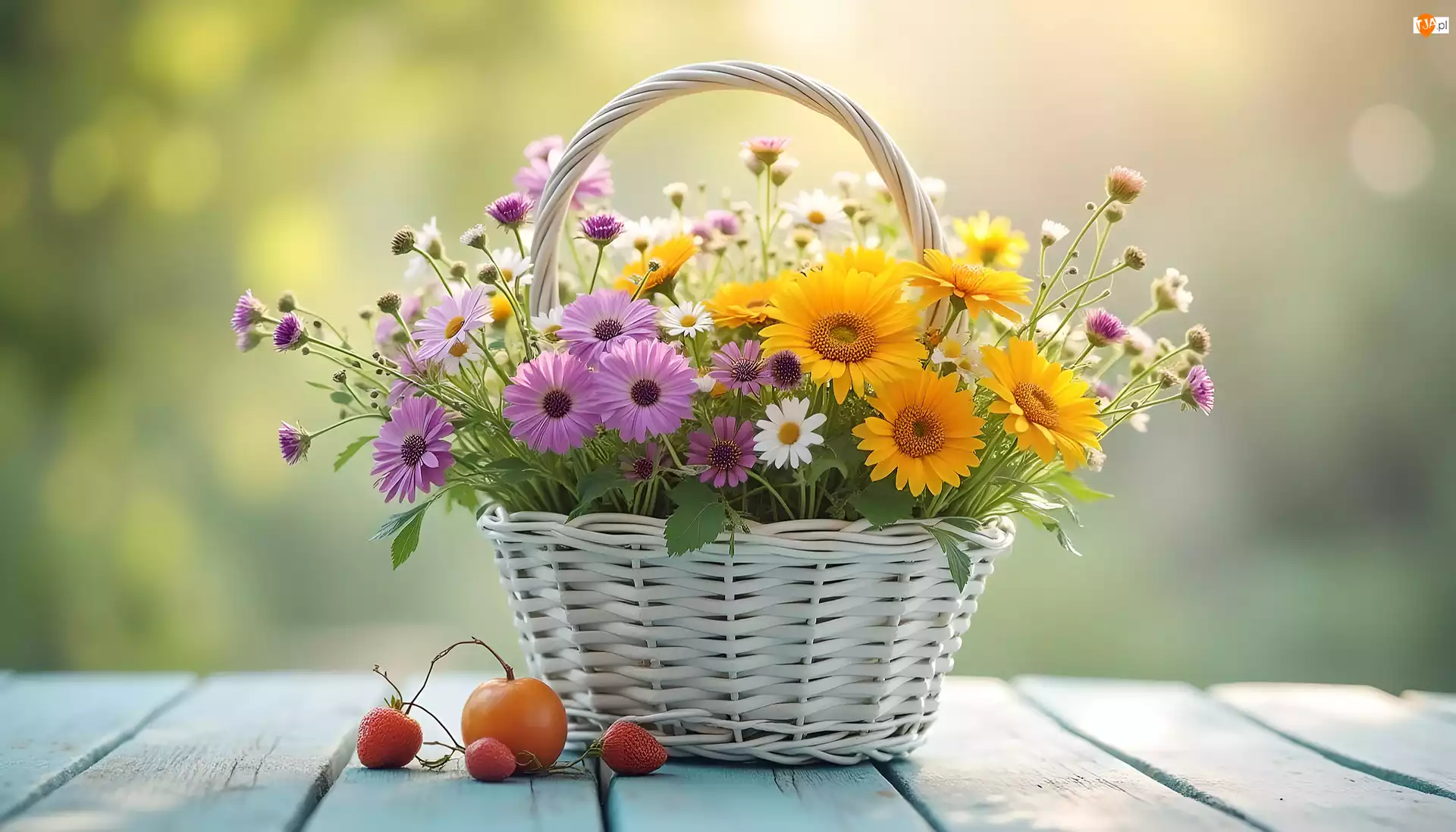 Koszyk, Grafika, Bukiet, Kwiaty, Truskawki