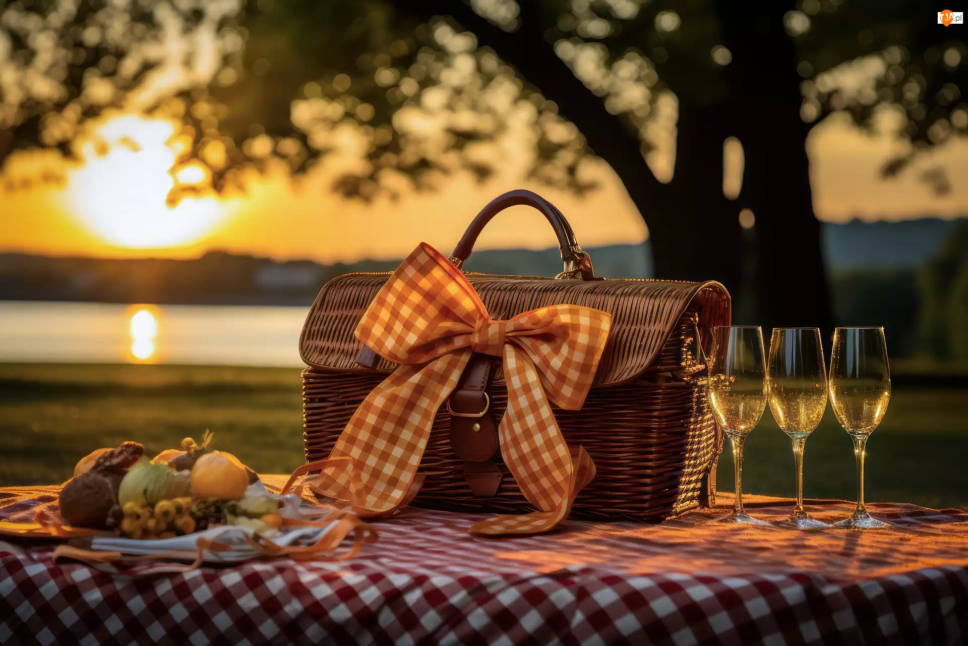 Koszyk, Kokarda, Kompozycja, Piknik, Grafika, Zachód słońca, Drzewo