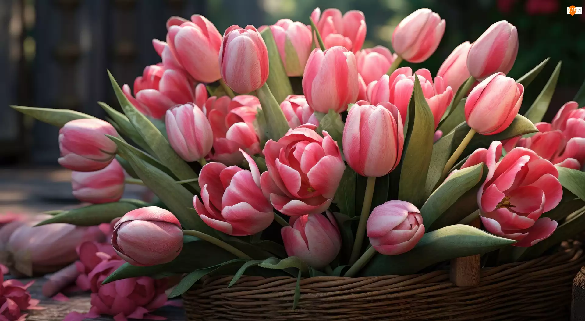 Koszyk, Różowe, Tulipany, Liście