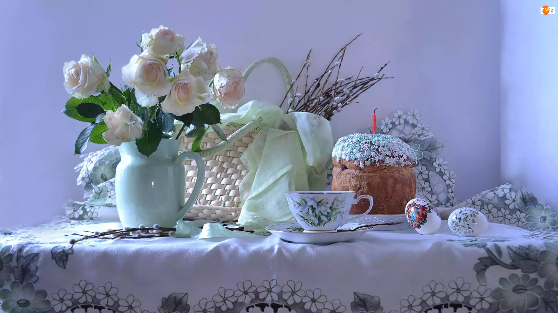 Dzbanek, Wielkanoc, Pisanki, Babka, Kosz, Róże, Filiżanka, Bazie