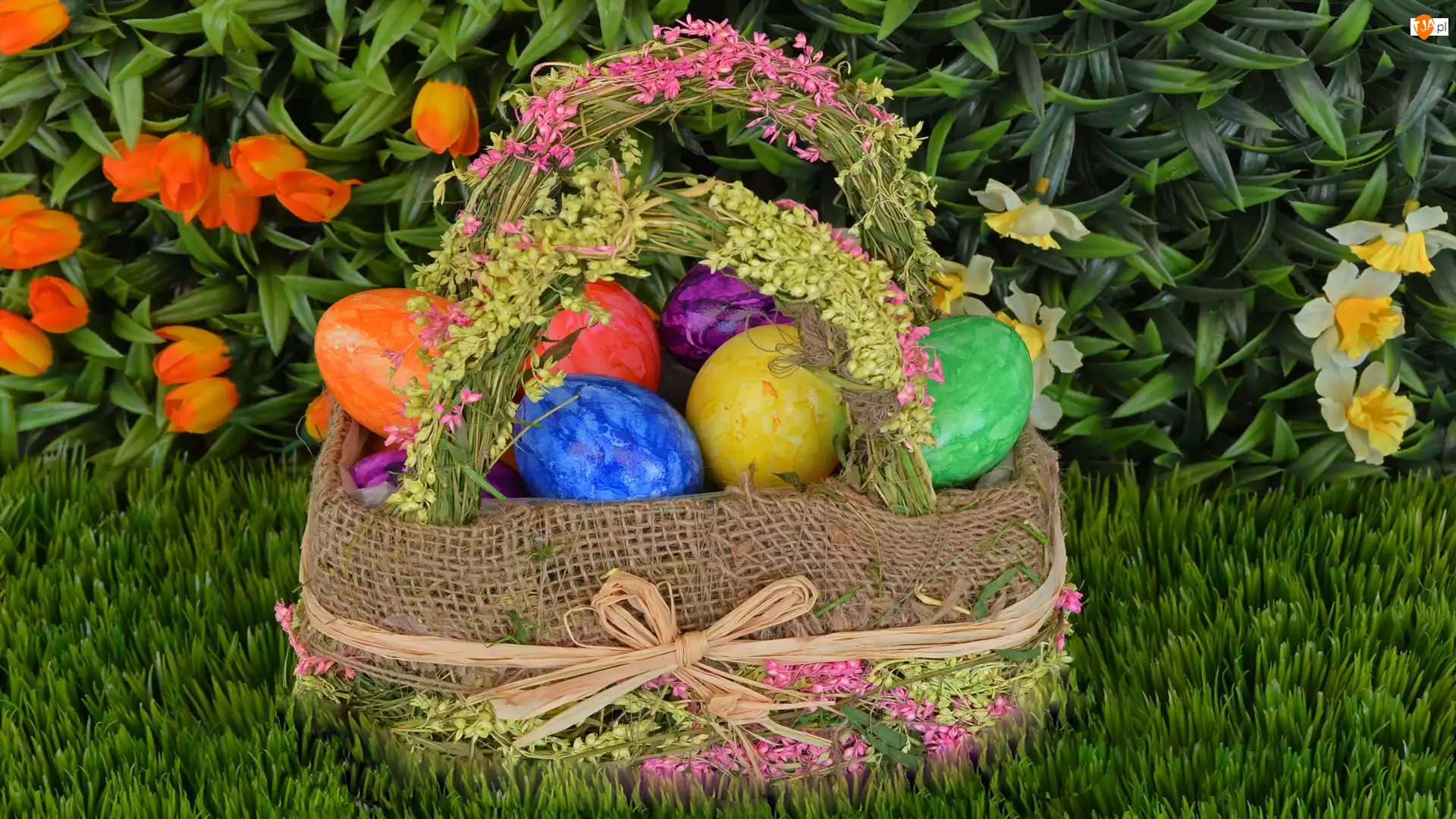 Koszyk, Kwiaty, Pisanki, Wielkanoc, Trawa