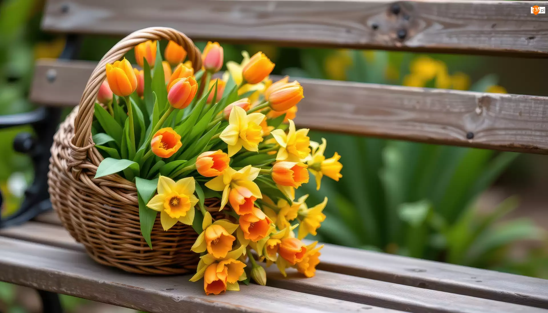 Koszyk z tulipanami i żonkilami na ławce