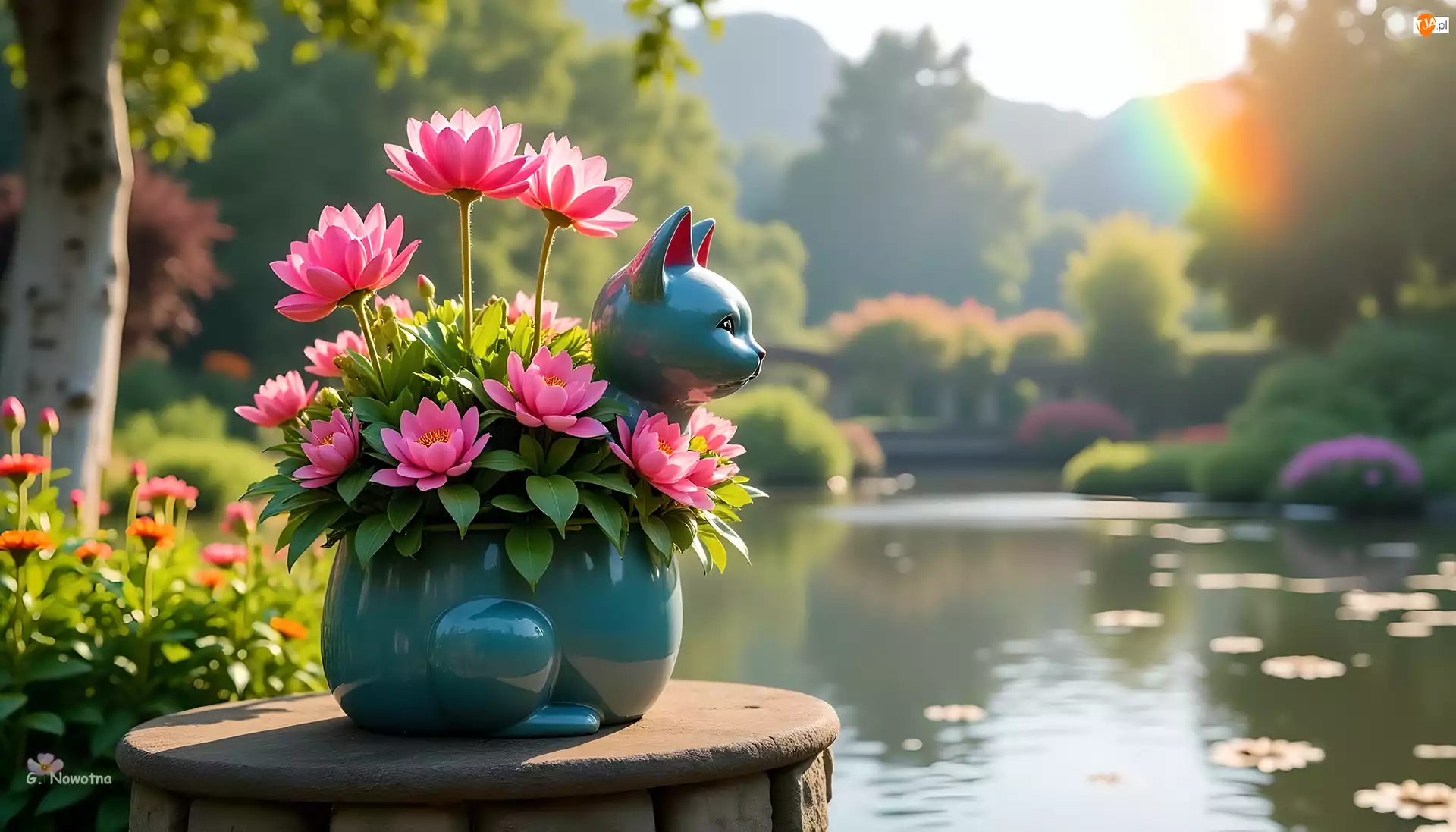 Kot, Grafika, Kwiaty, Doniczka, Jezioro