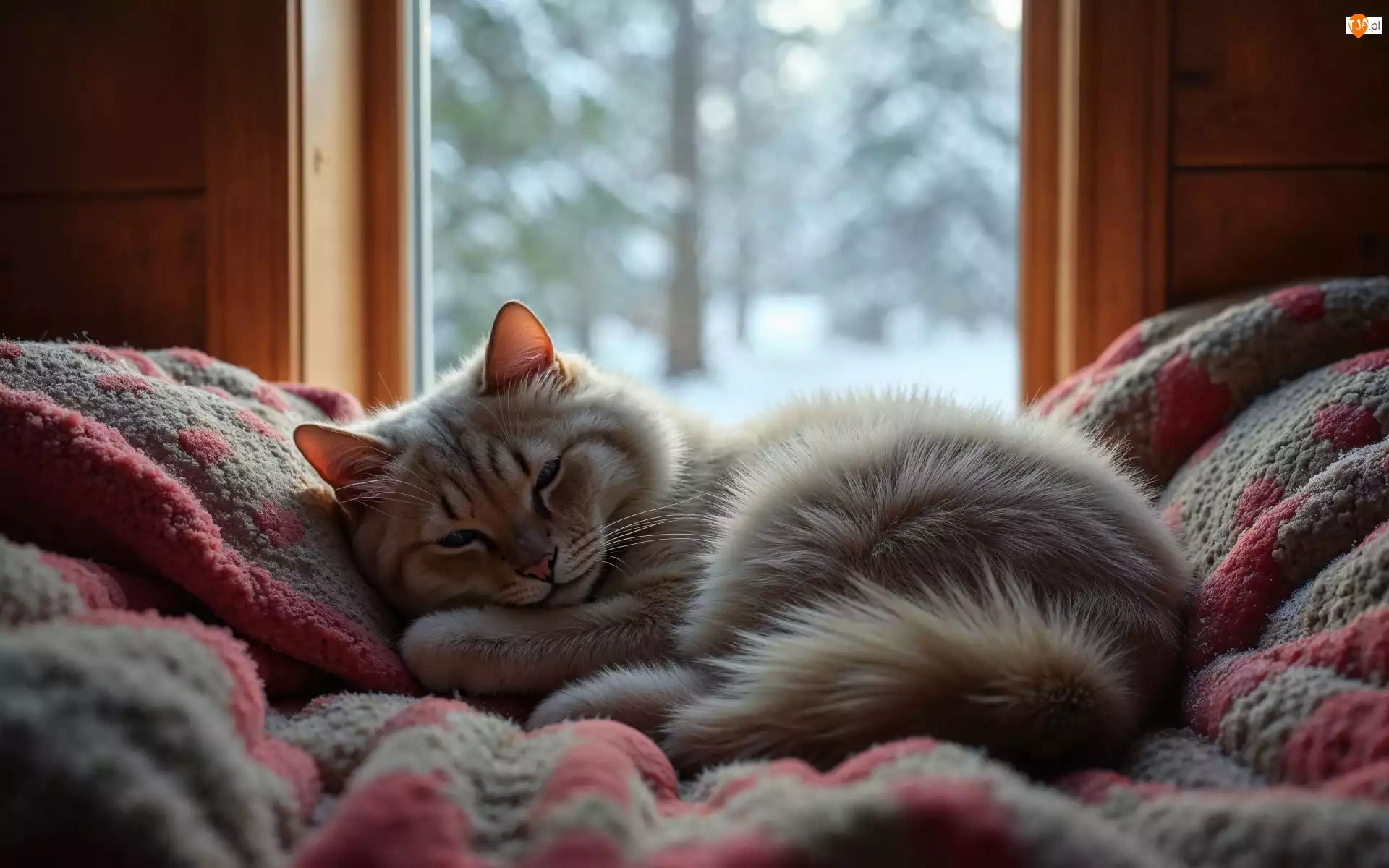 Kot, Leżący, Oczy, Okno, Przymrużone, Koc