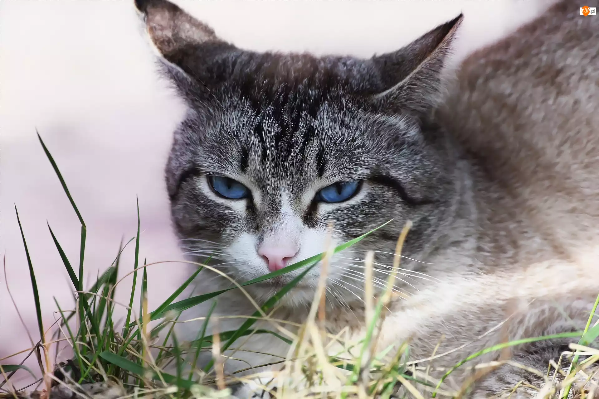 Niebieskie, Kot, Spojrzenie, Trawy, Oczy, Źdźbła