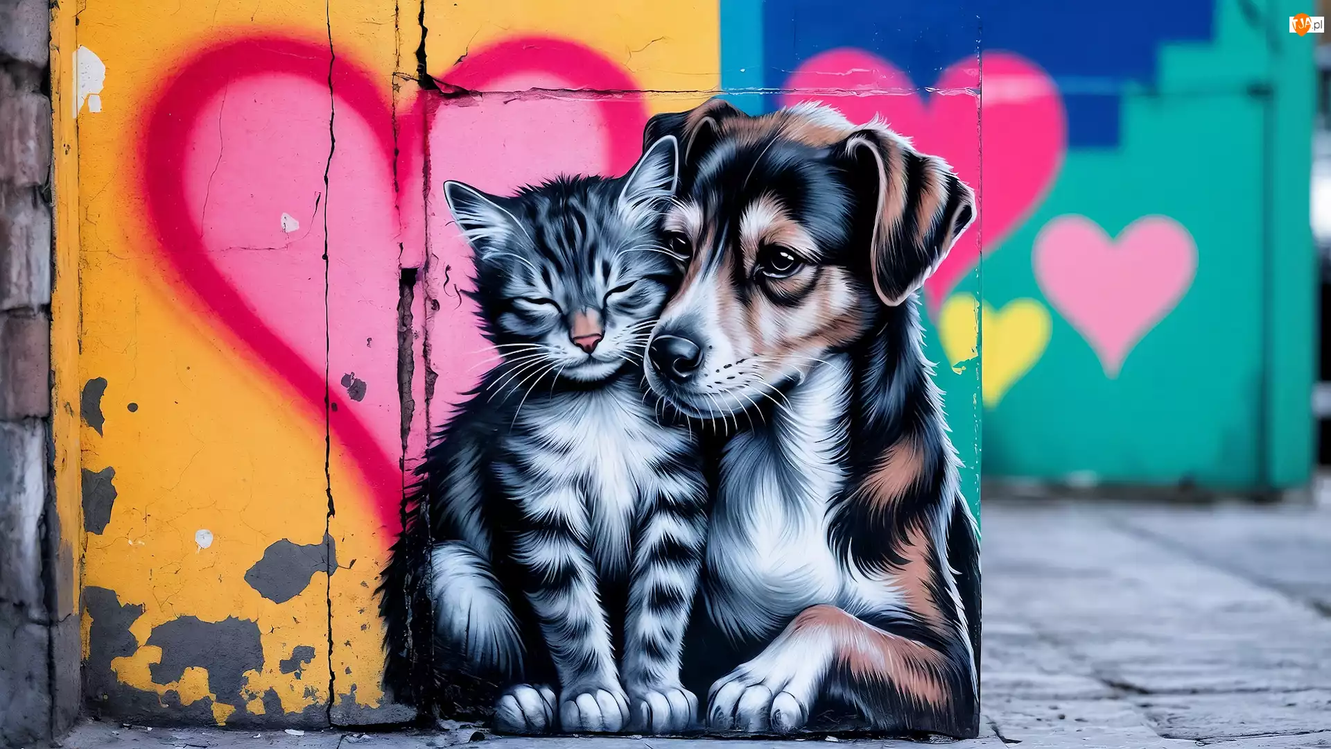Kot, Pies, AI, Street Art, Grafika, Mural, Serce