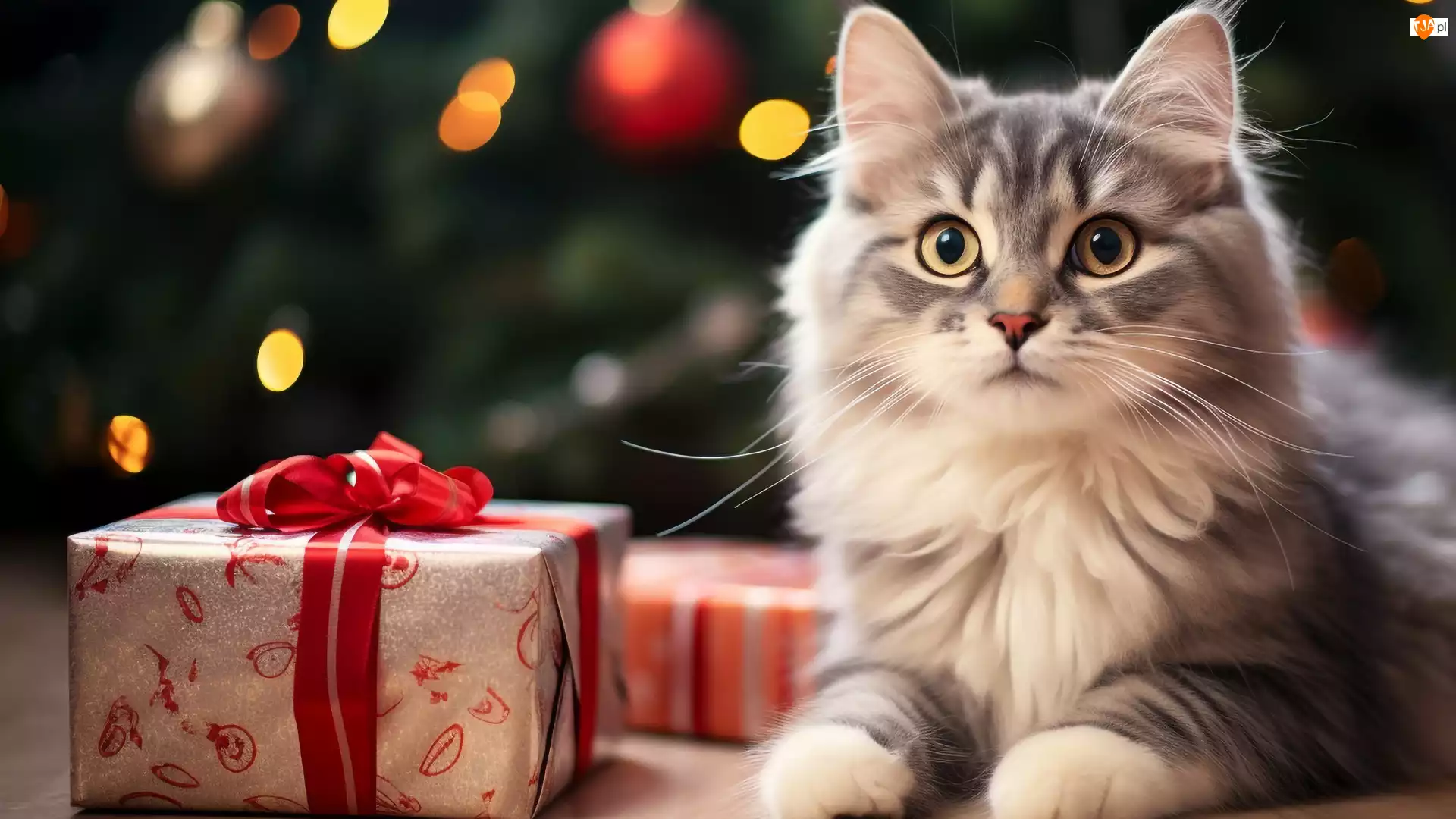 Kotek, Prezenty, Światełka, Puszysty, Bombki, Kokarda, Czerwona
