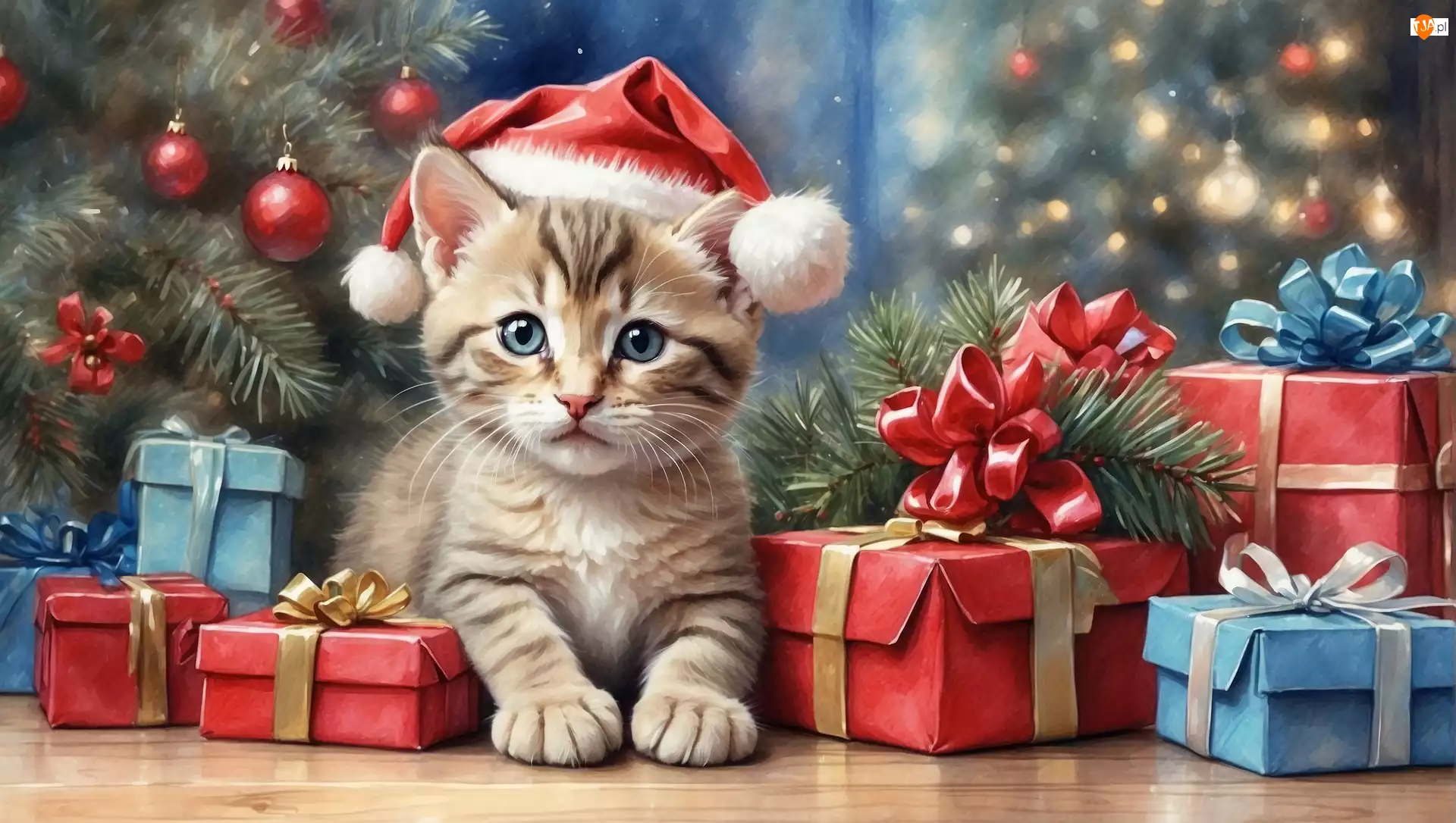 Kotek w czapce Mikołaja wśród prezentów obok c