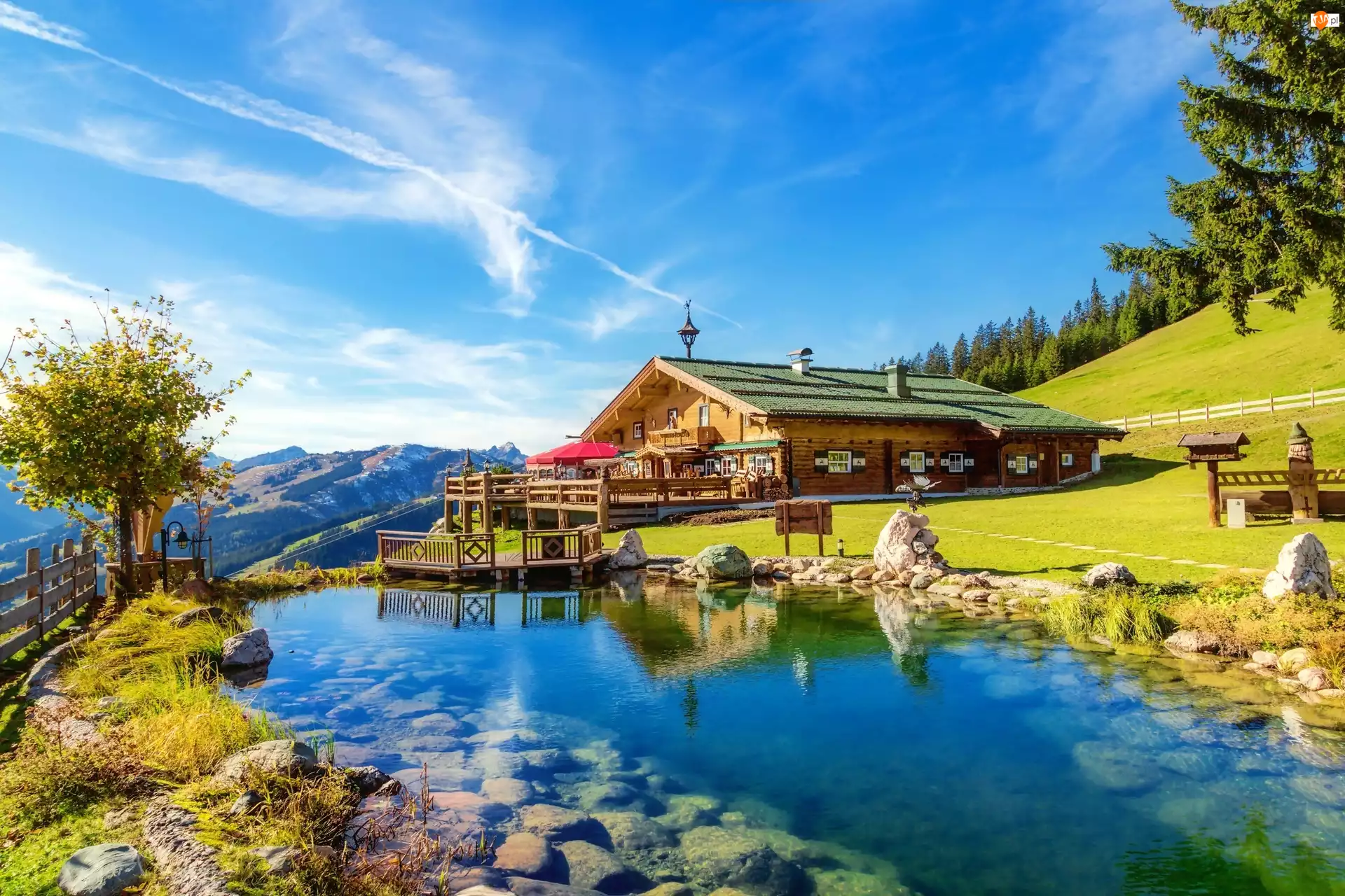 Krajobraz, Górski dom, Staw
