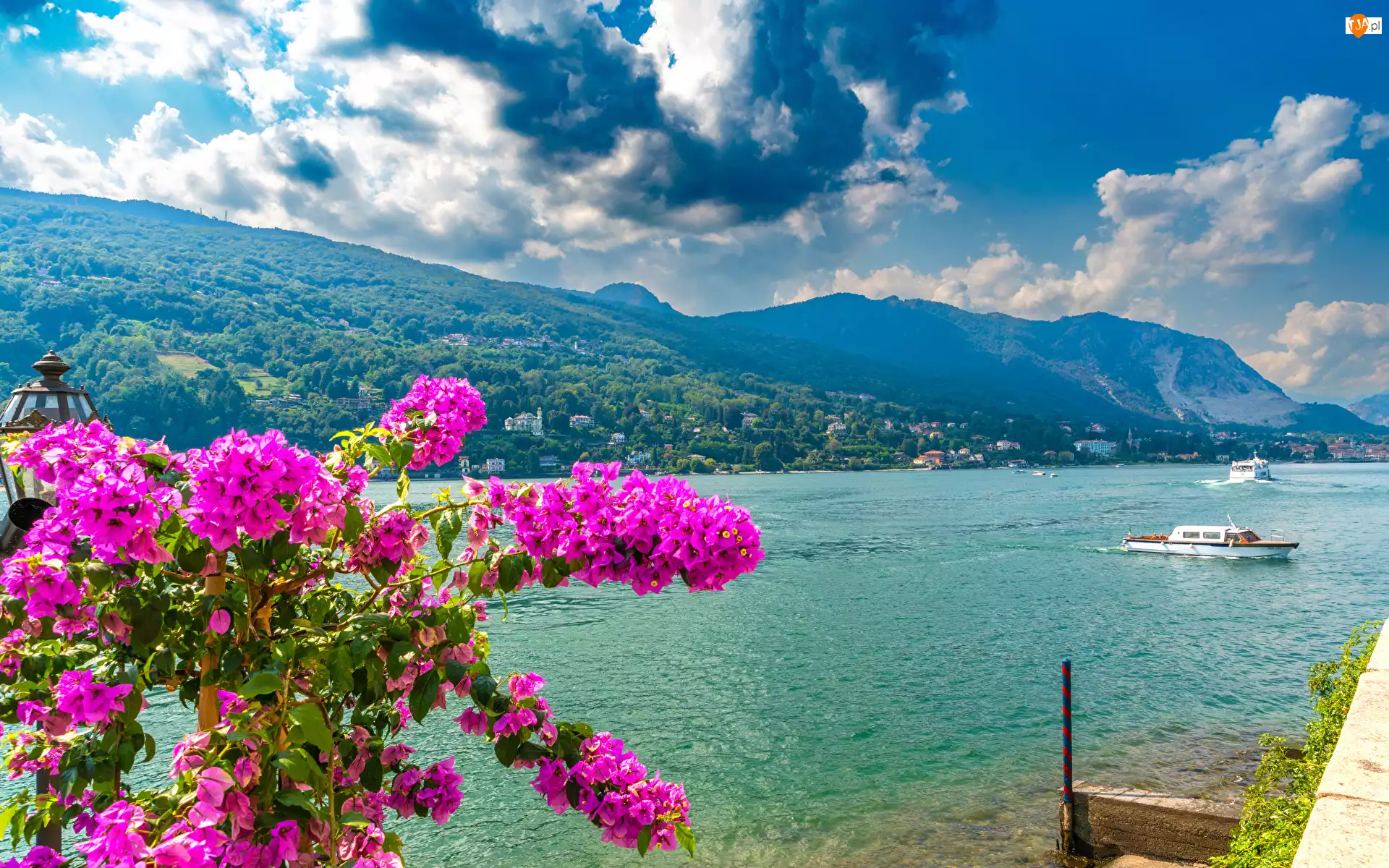 Lago Maggiore, Jezioro, Kwiaty, Włochy, Chmury, Niebo, Góra