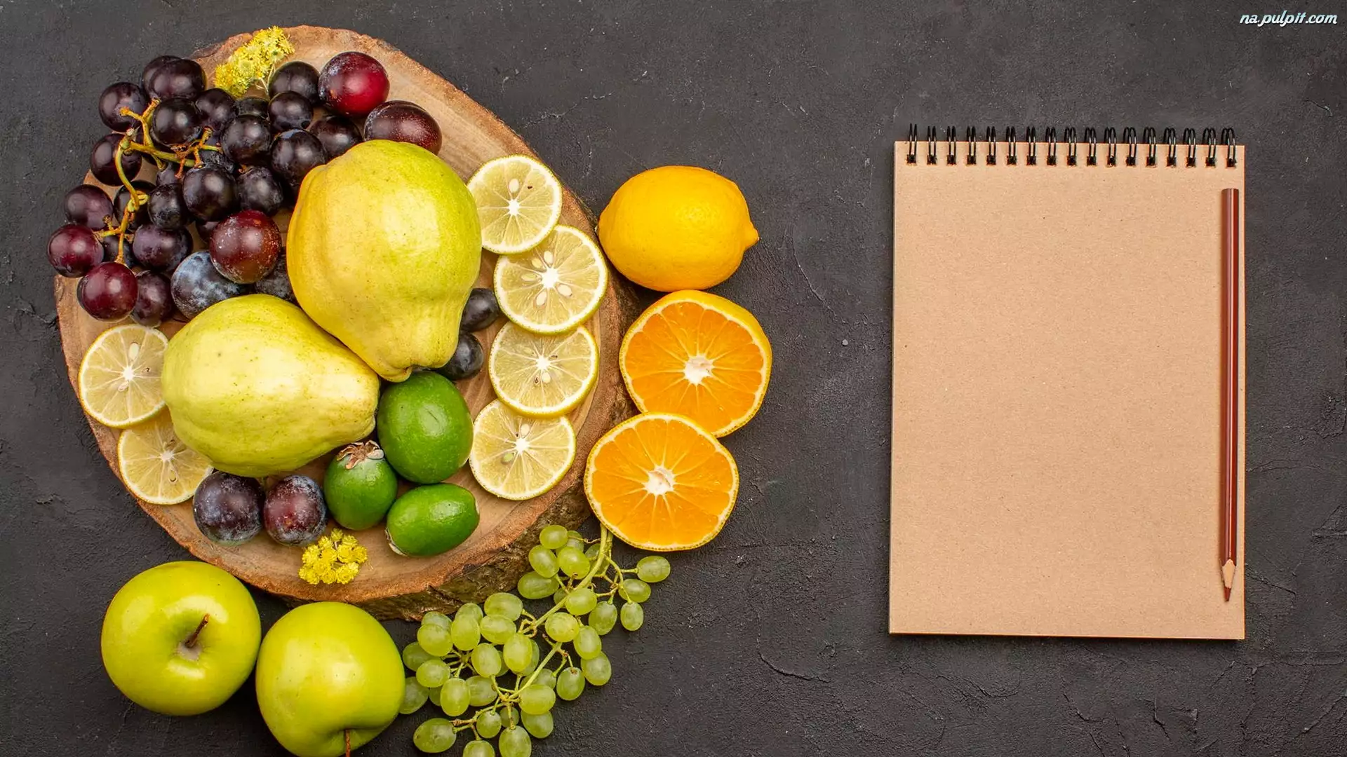 Kredka, Winogrona, Notes, Pomarańcze, Deska, Cytryny, Jabłka, Owoce, Gruszki