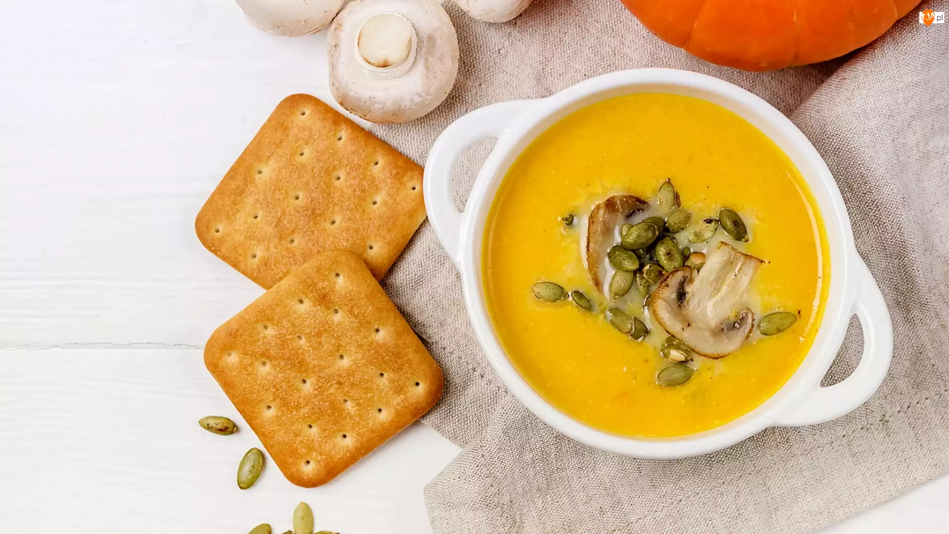 Krem z dyni obok krakersów