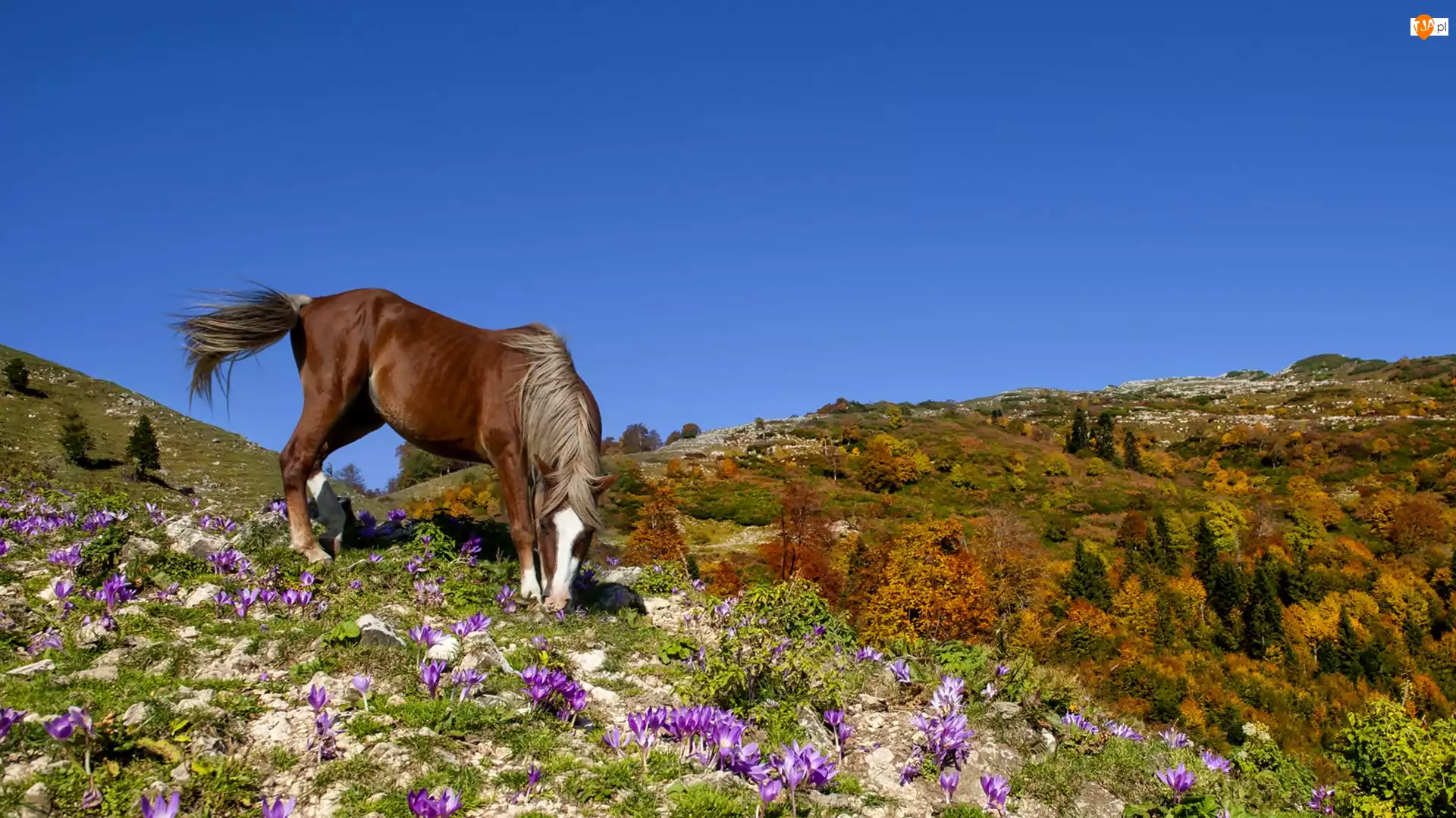Krokusy, Koń, Drzewa, Wzgórza, Jesienne