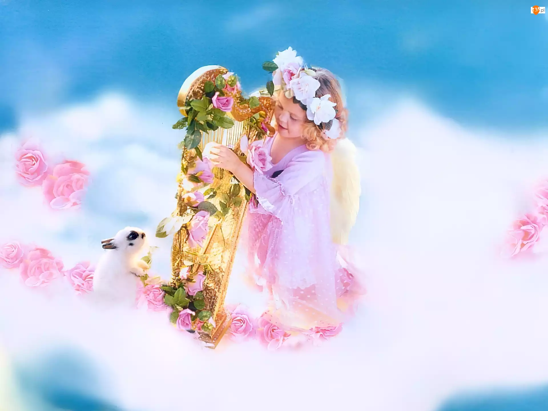 Chmurki, Króliczek, Aniołek, Dziecko, Harfa