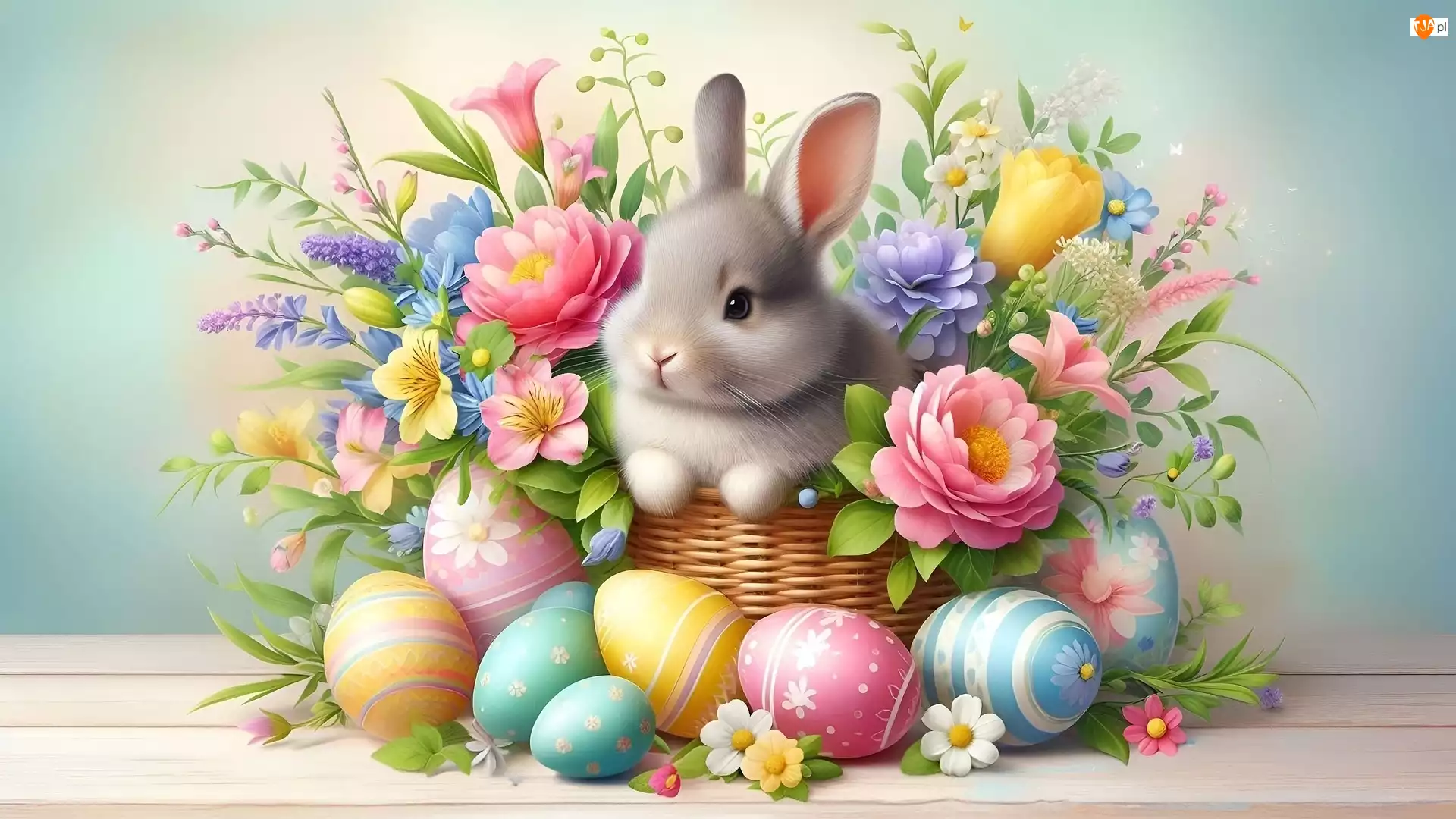 Królik, Wielkanoc, Koszyk, Grafika, Pisanki, Kwia