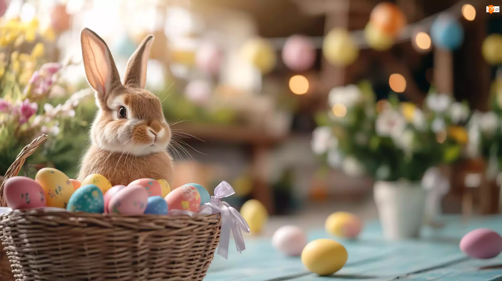 Królik, Wielkanoc, Pisanki, Kwiaty, Jajka, Koszyk