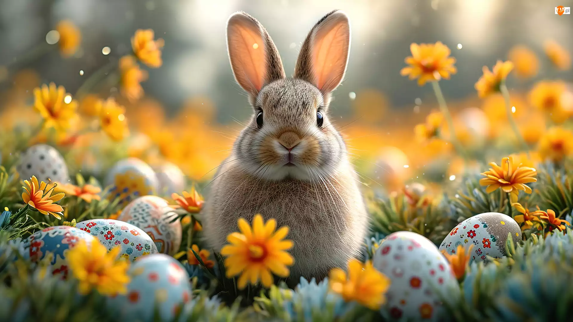 Królik, Wielkanoc, Pisanki, Kwiaty, Kolorowe, Żółte