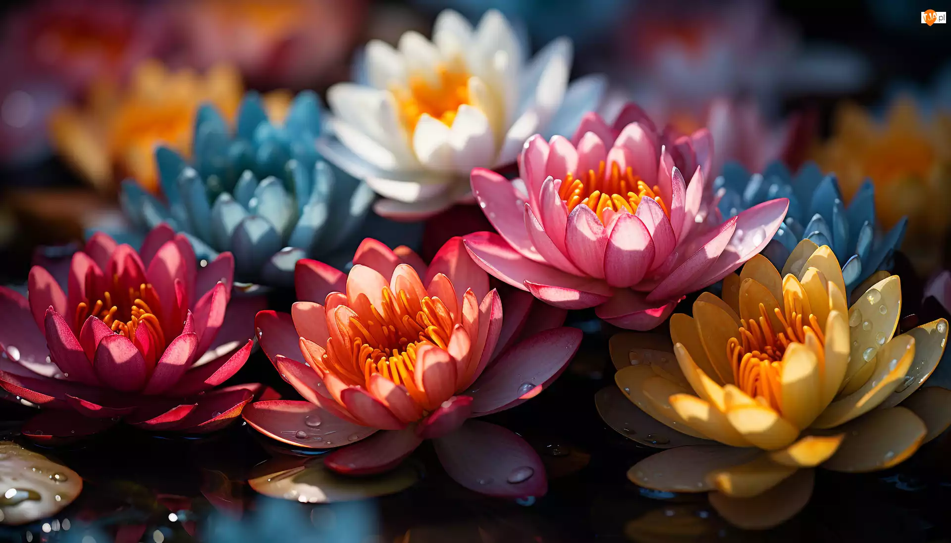 Krople, Kolorowe, Kwiaty, Lilie wodne