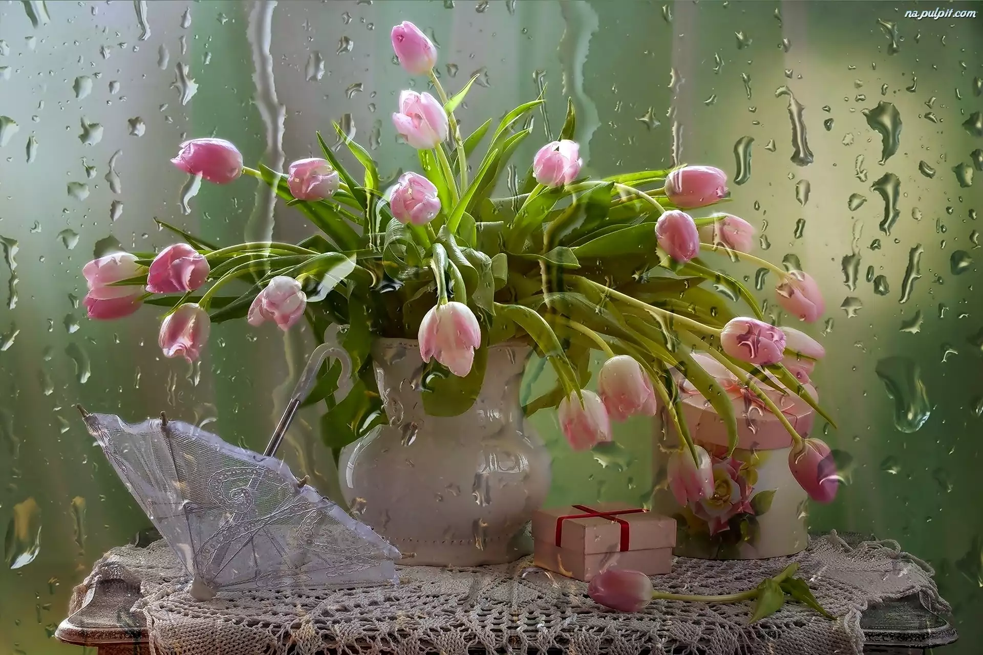 Krople, Kompozycja, Tulipany, Parasolka, Bukiet, Prezent, Serwetka, Kwiatów