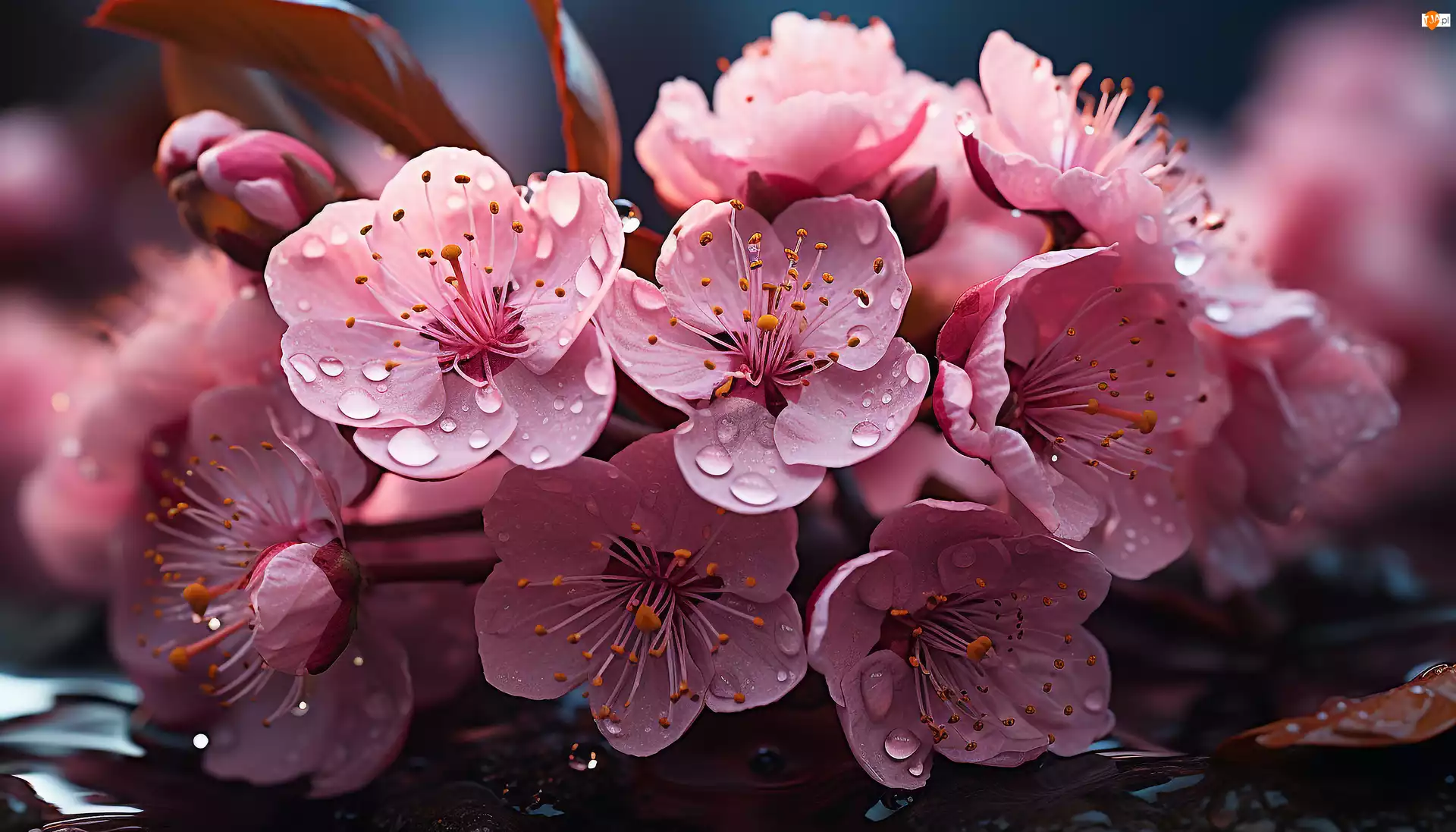 Krople, Różowe, Kwiaty, Drzewo owocowe