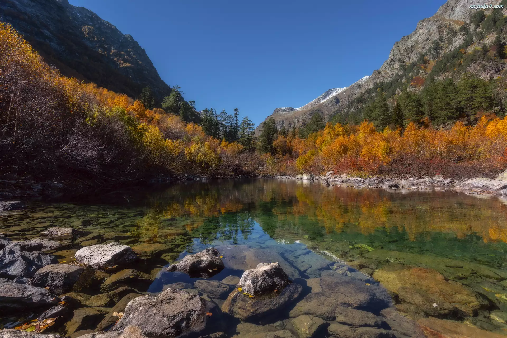 Krzewy, Jesień, Kamienie, Rzeka, Góry